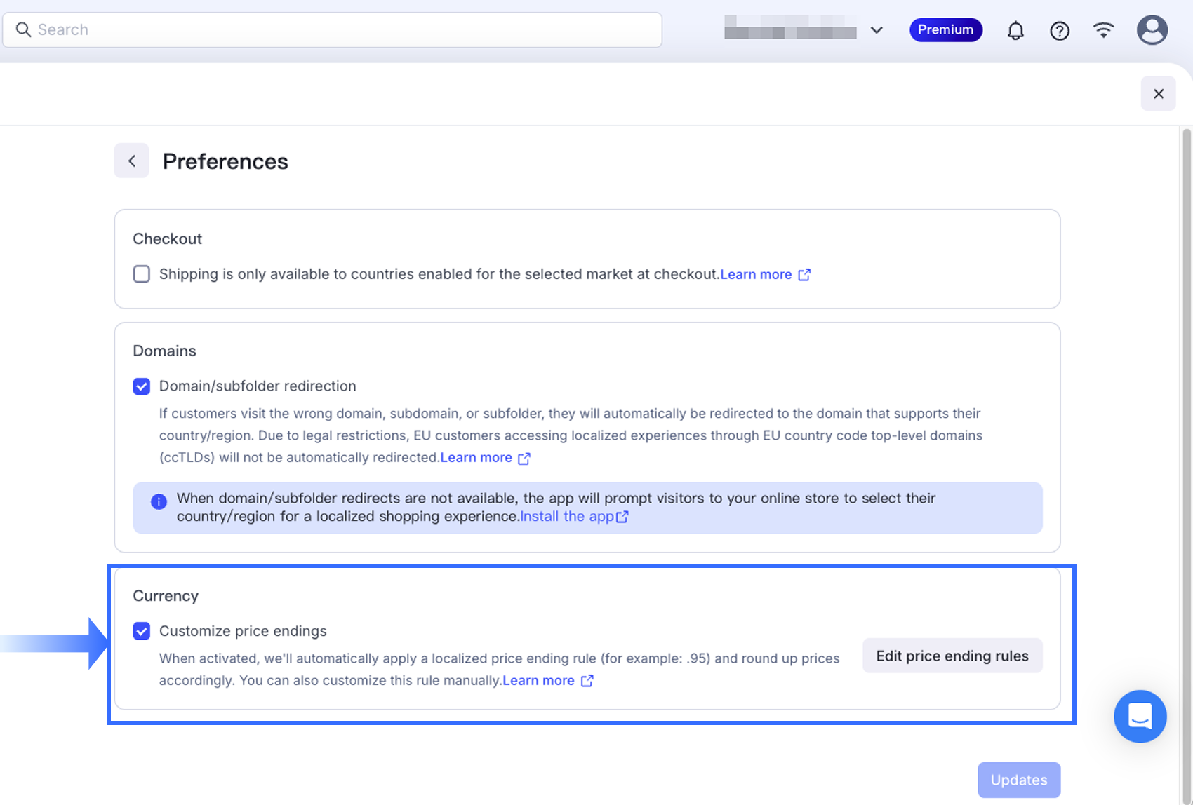 Merchants can enable the custom price endings feature in the Markets Preferences settings. For currencies that support customization, you can also manually set the price ending rules. Currencies that do not support customization will appear greyed out and cannot be modified.