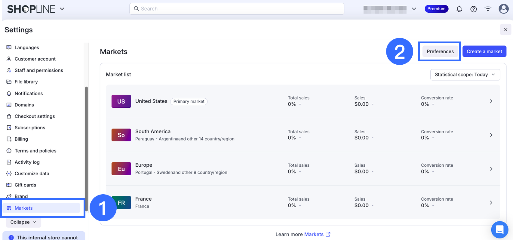 From your SHOPLINE admin panel, go to Settings > Markets and click Preferences.