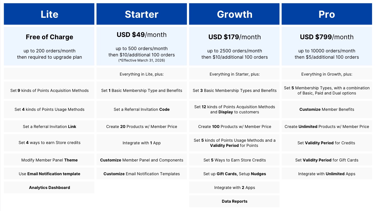 | Note (Effective March 31, 2026): Starting March 31, 2026, if the Starter plan exceeds its order limit, additional order fees will apply, and the impact will follow the same rules as the Growth and Pro plans. |