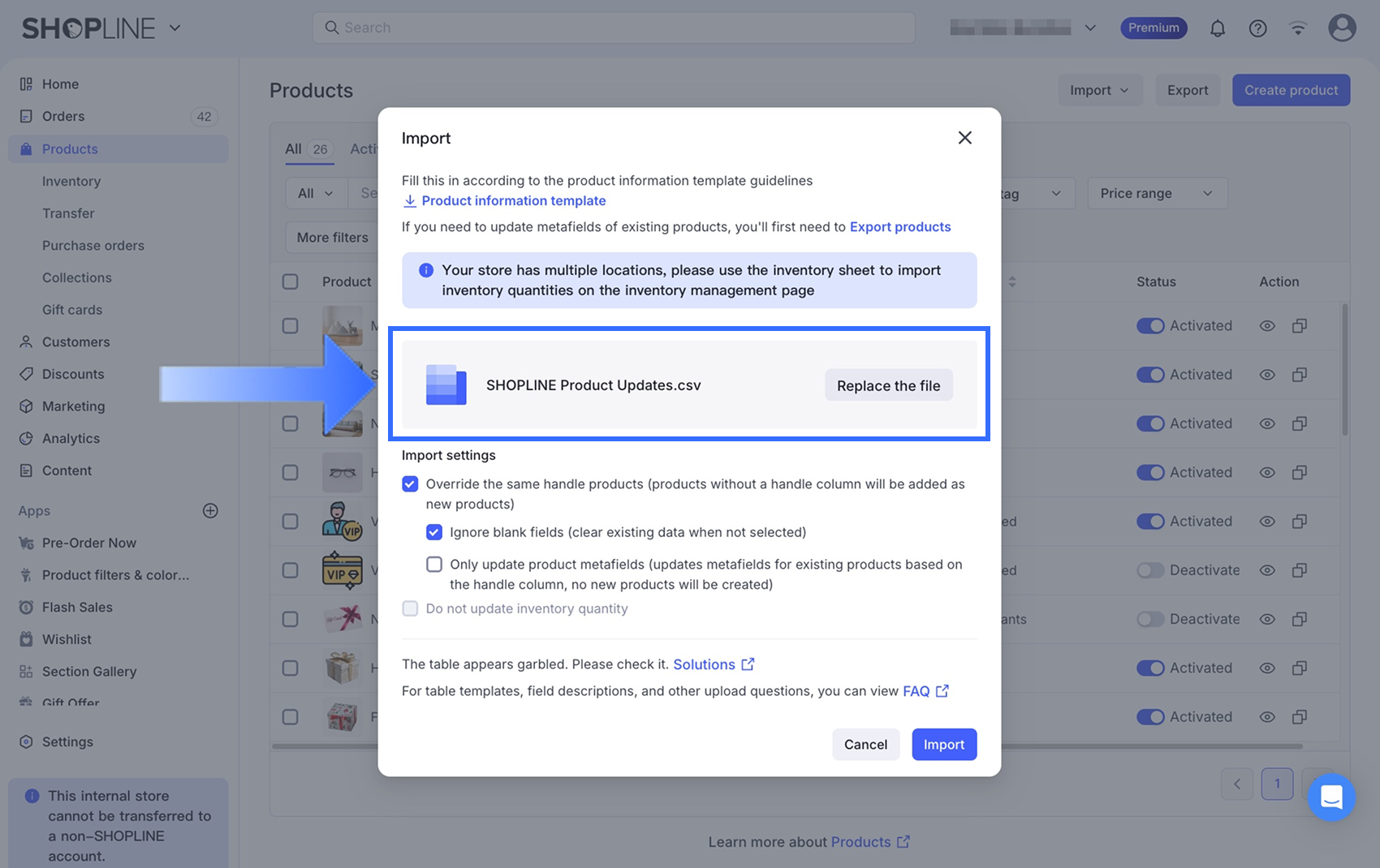 Once you have completed your product template, you can upload it to your SHOPLINE Admin to create or update products in bulk.
