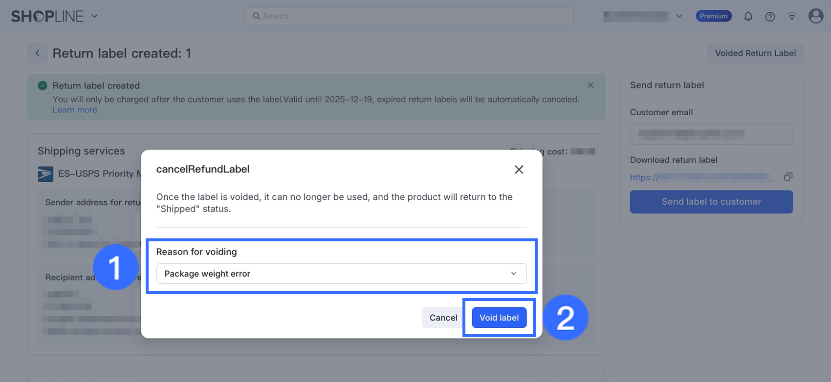 - Click Send label to customer to have SHOPLINE automatically email the return label to the customer.
