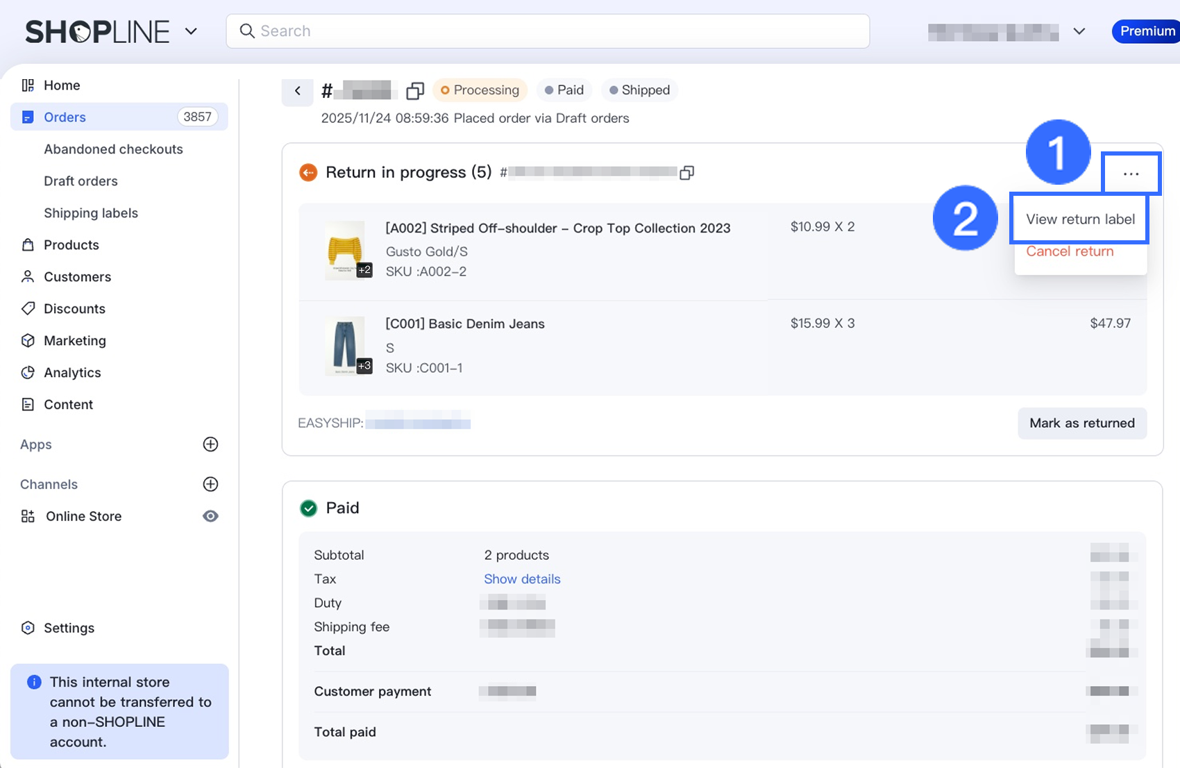 - In your SHOPLINE admin panel, go to Orders and select the order that you want to cancel the return label for.