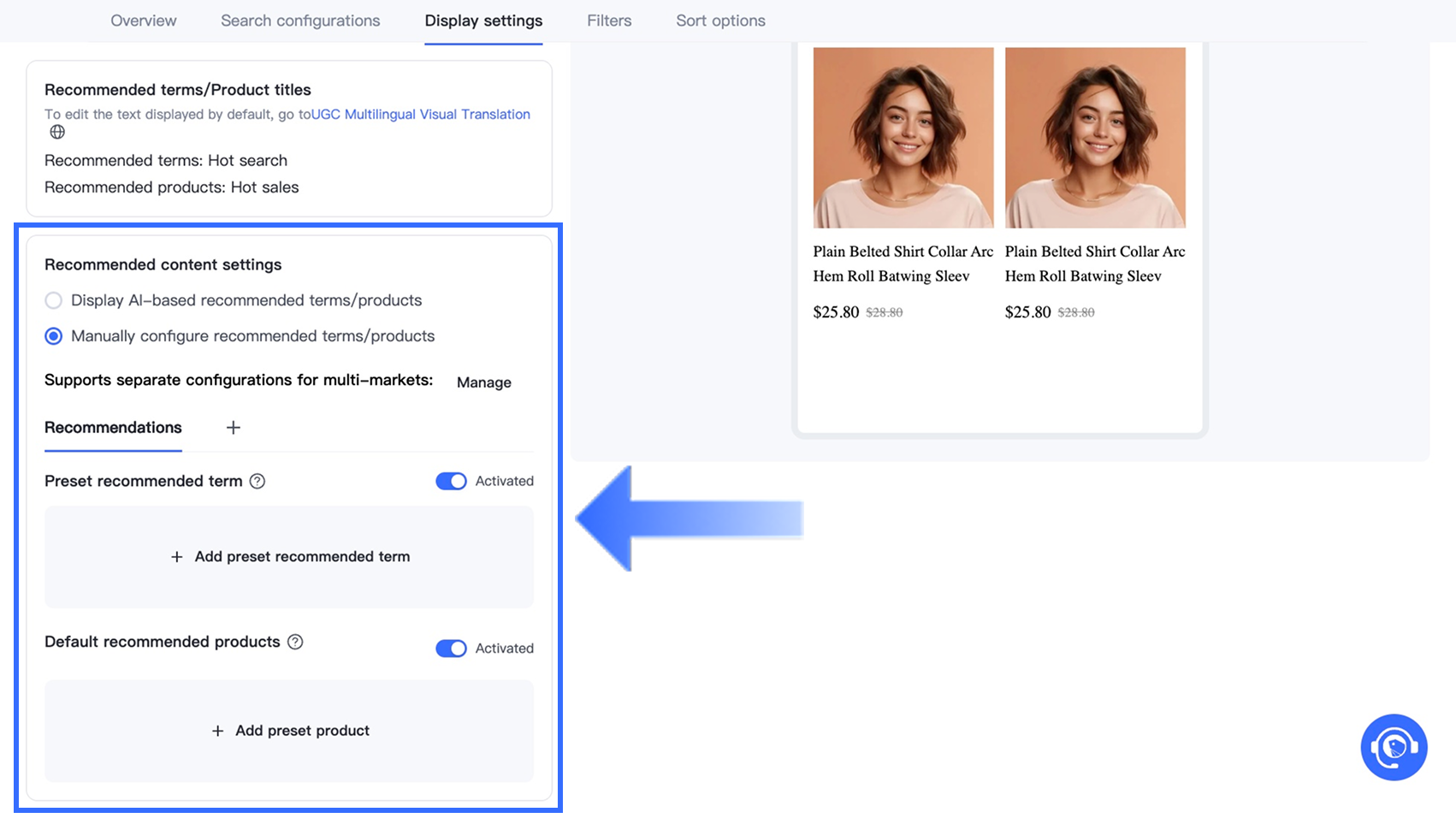Recommended content settings: Choose how keywords and products are displayed before a search: