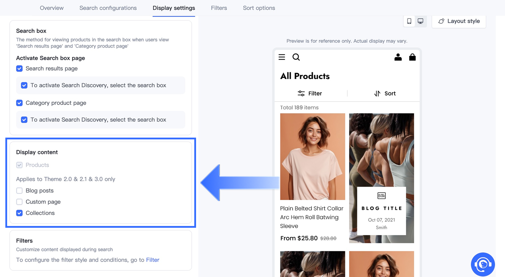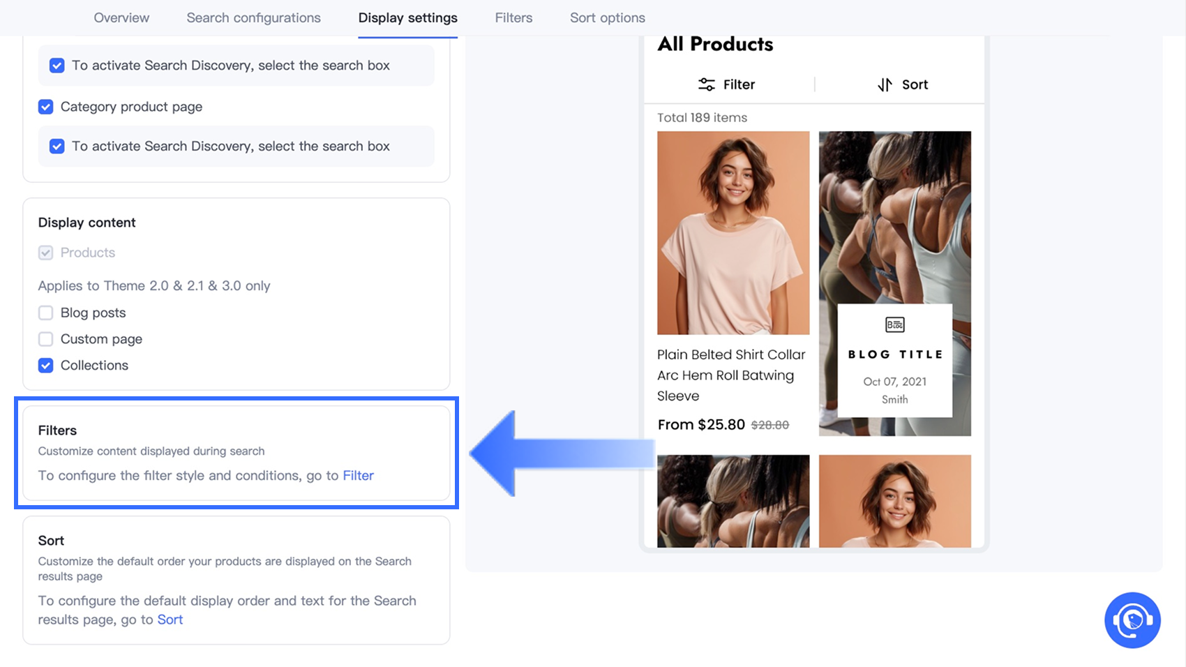 Set up filters to help users narrow down search results. Configure filter options and display styles in the Filters tab.