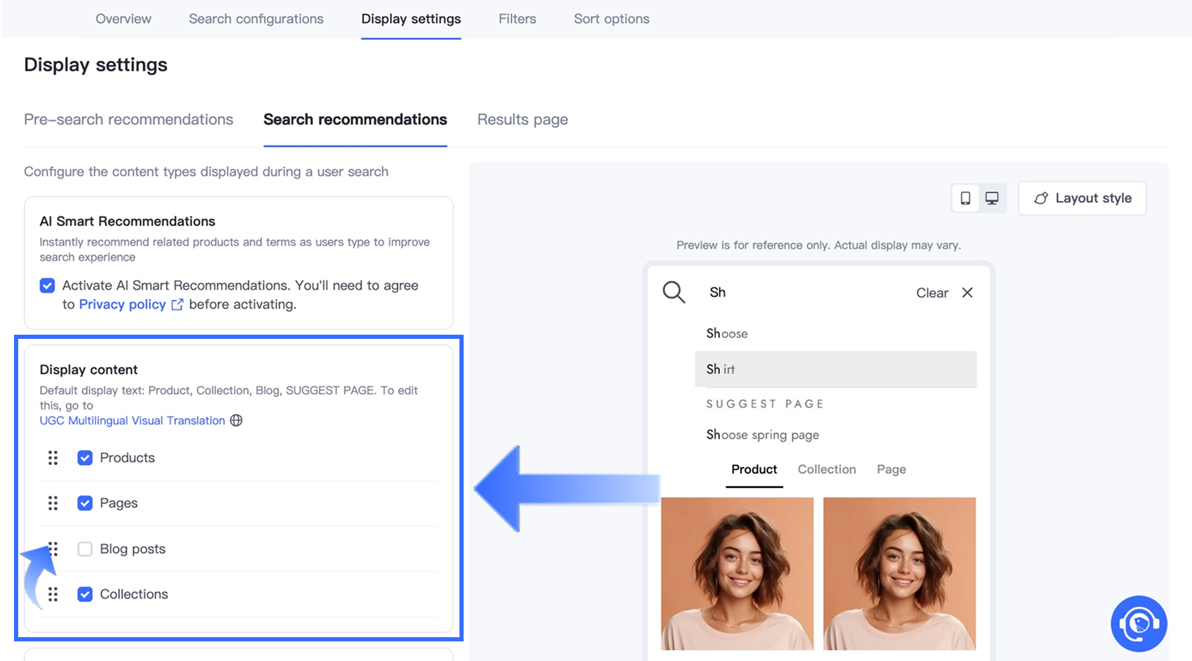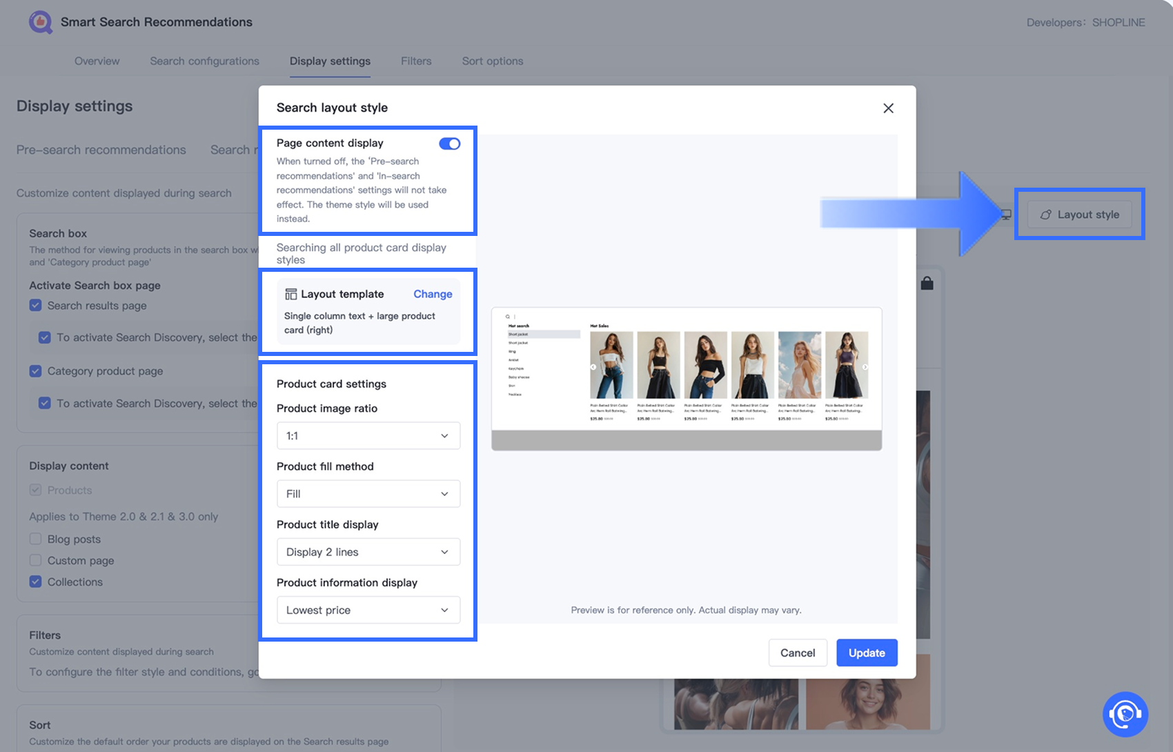 Click the Layout style button in the upper-right corner to customize the layout template and product card display, helping you improve the visual appeal of your search recommendation results.