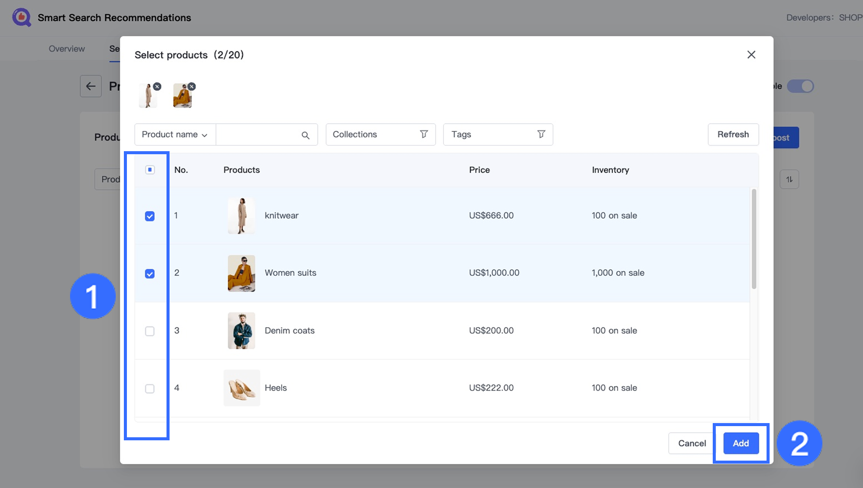 In the pop-up window, select one or more products from your store and click Add. You can add up to 2,000 products to the promotion list.
