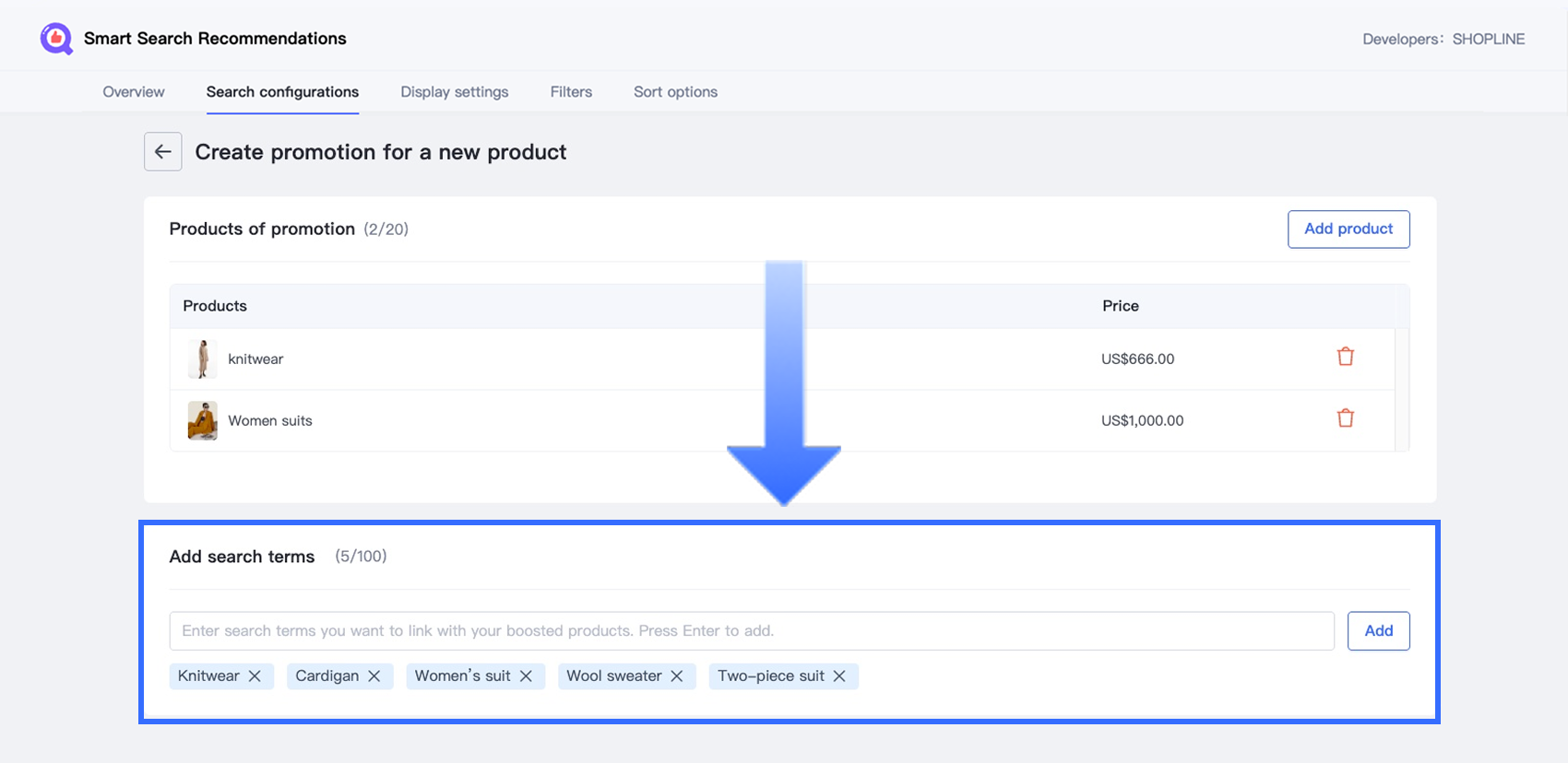 Product promotion allows you to feature specific products at the top of search results when customers enter designated keywords. To set it up: