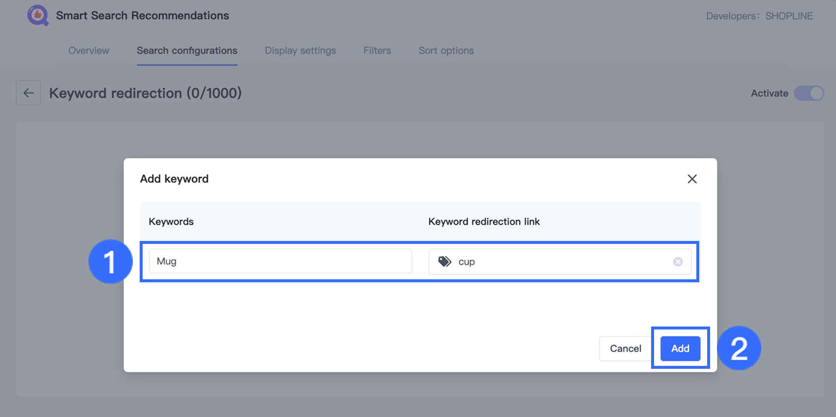 Click Add keyword. You can create up to 1,000 redirection keywords.