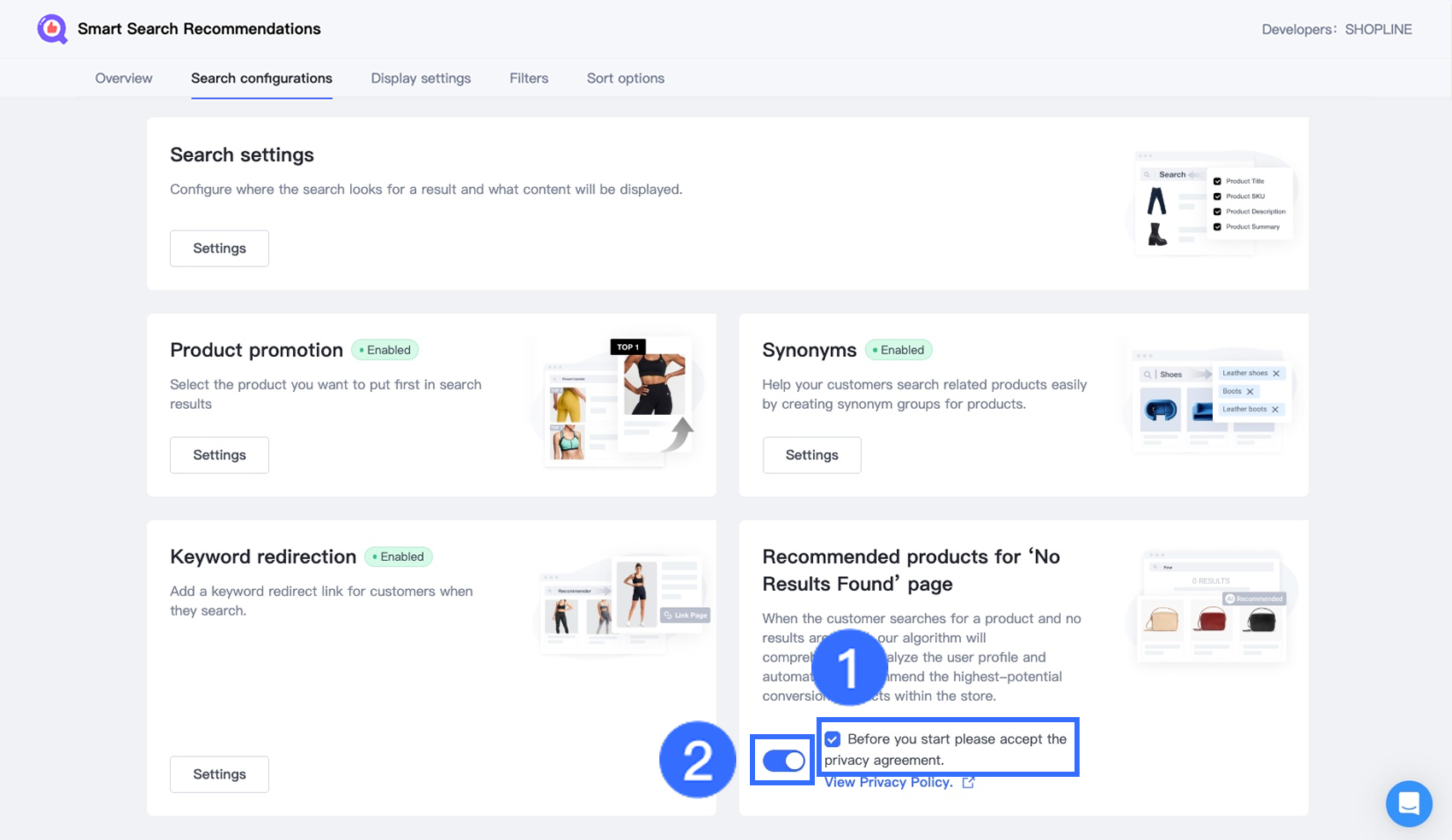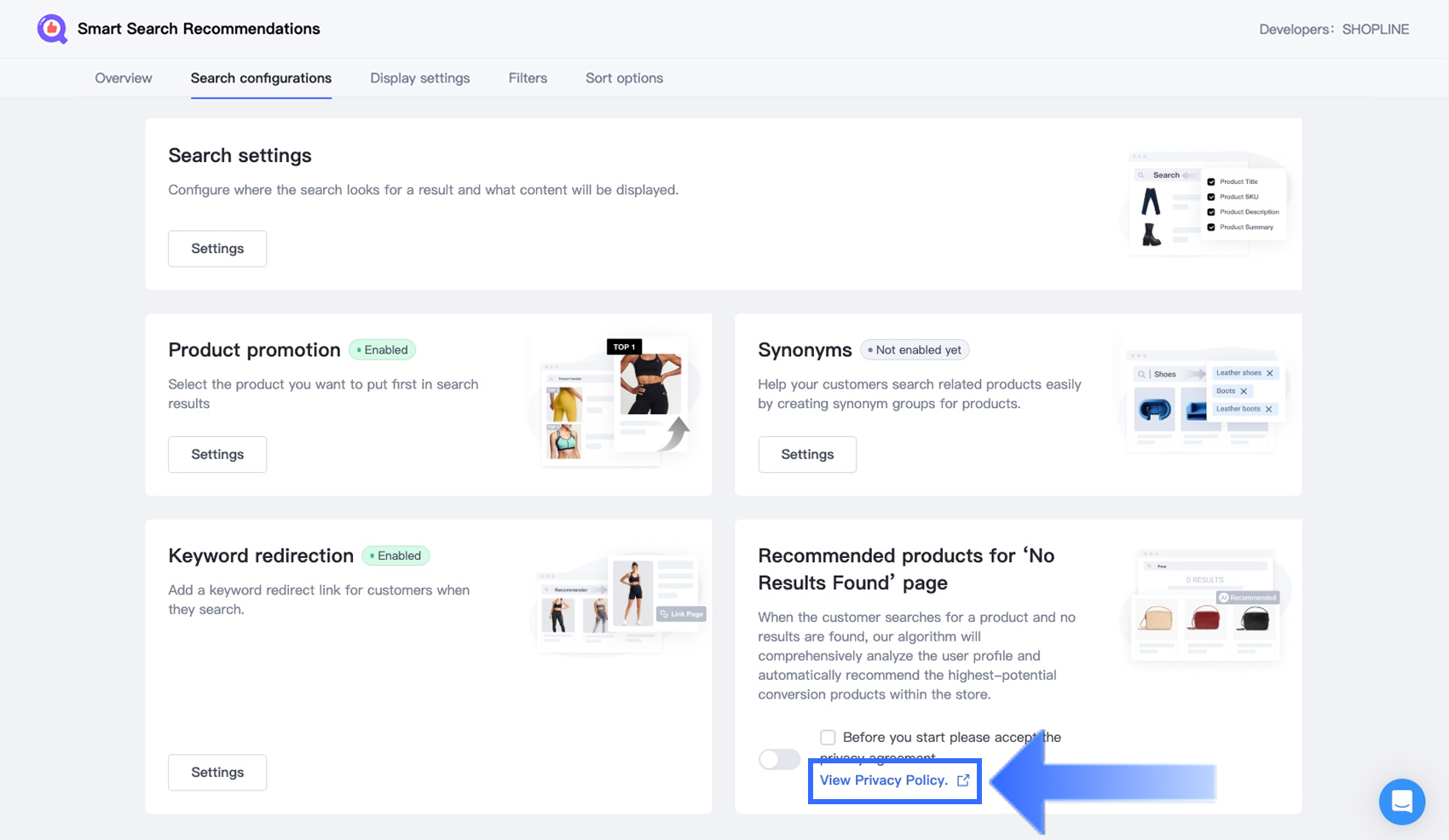 Go to Search configurations > Recommended products for "No Results Found" page. Click View Privacy Policy to review the rules carefully.