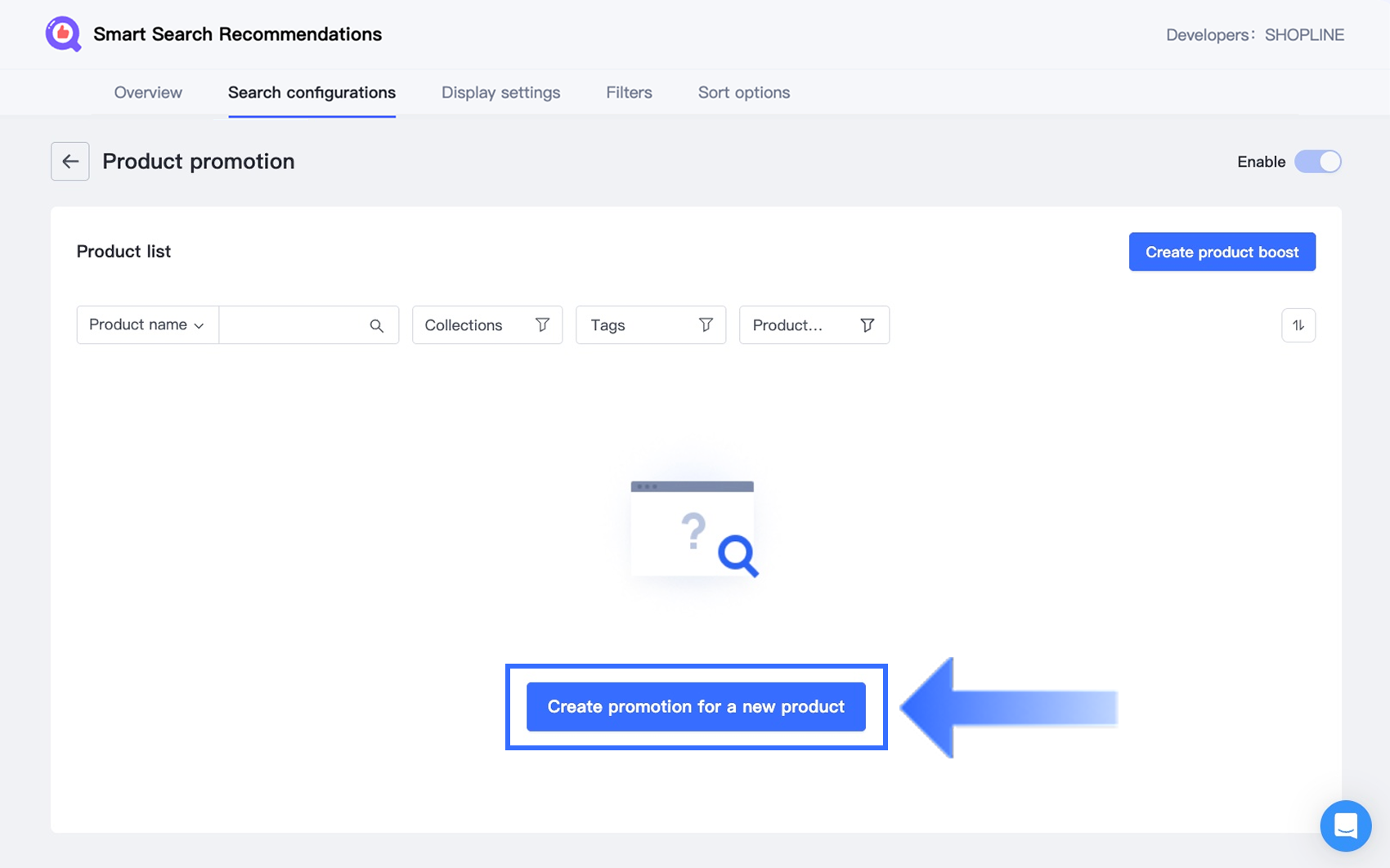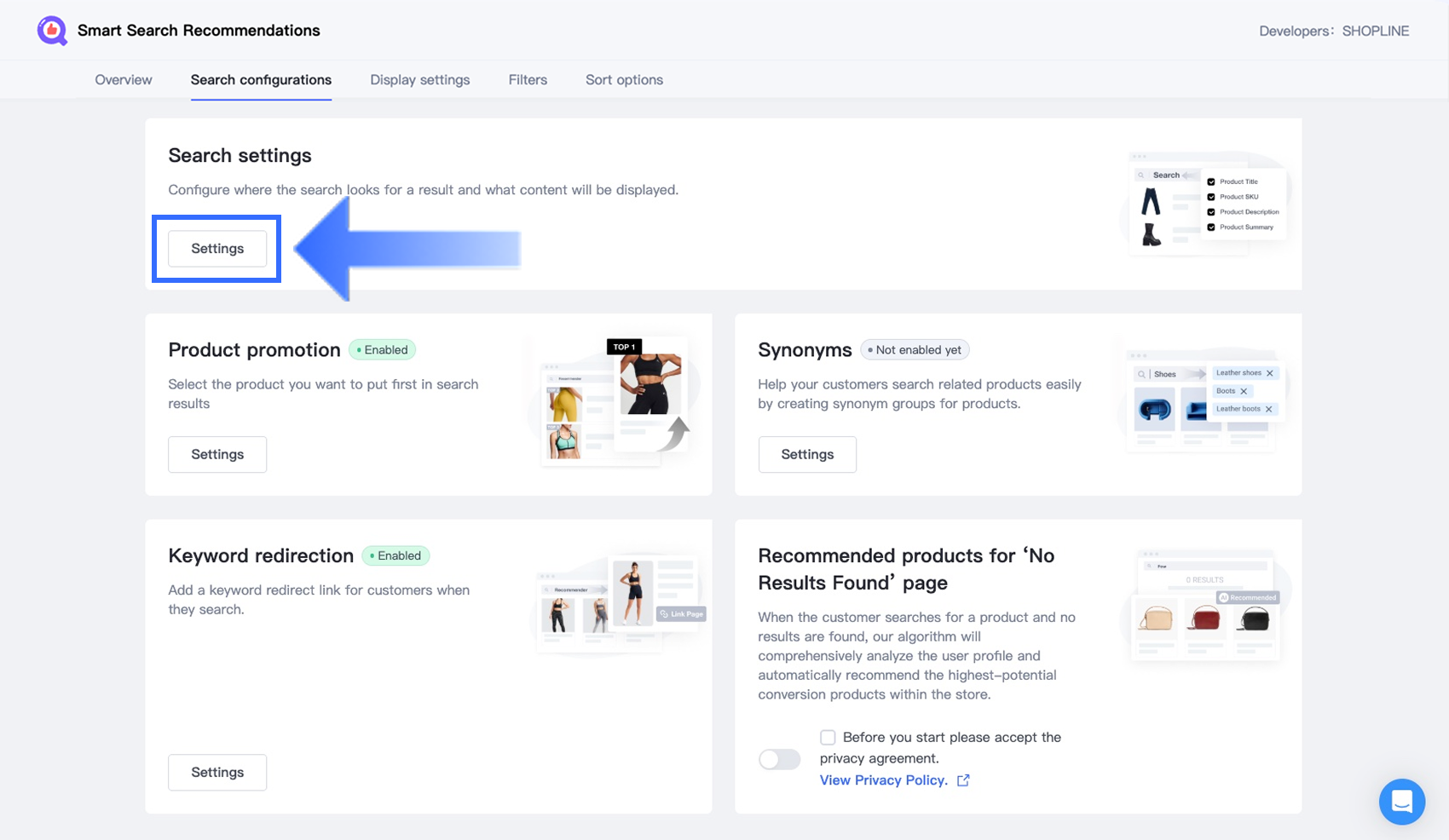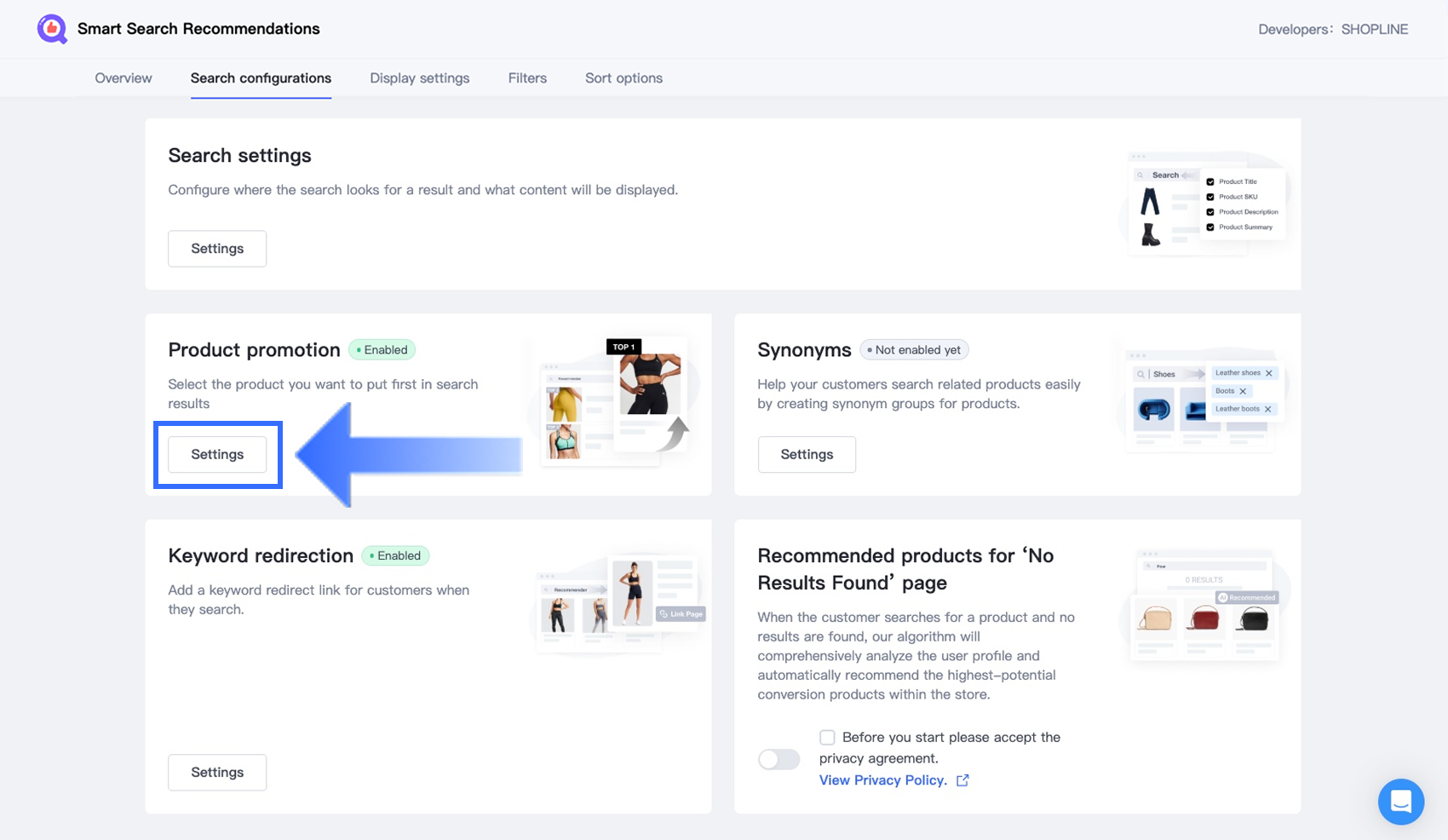 In the Search configurations section, locate the Product promotion card and click Settings.