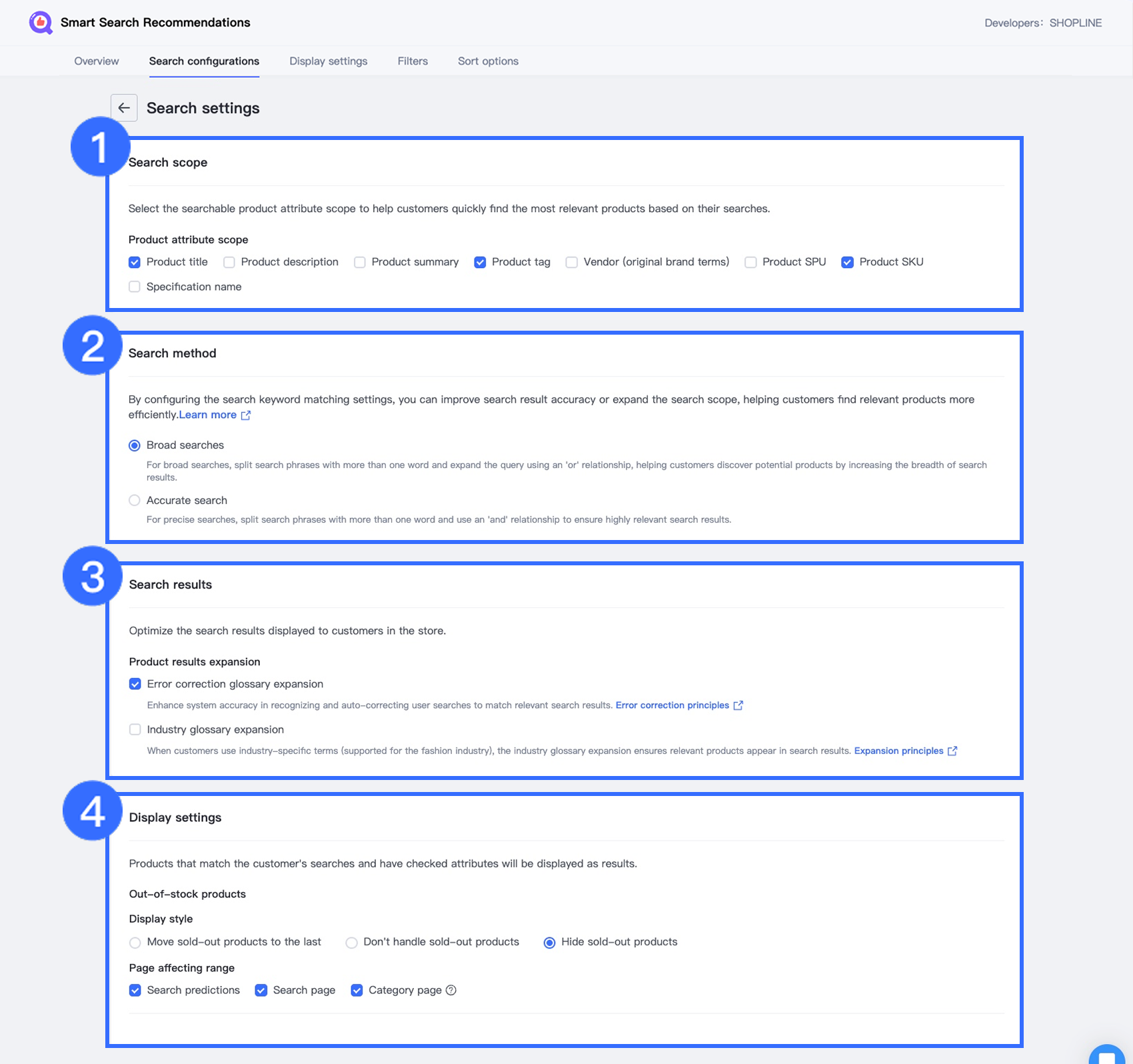 - Display settings: Configure how out-of-stock products are shown and decide whether results should appear in predictions, search pages, or category pages.