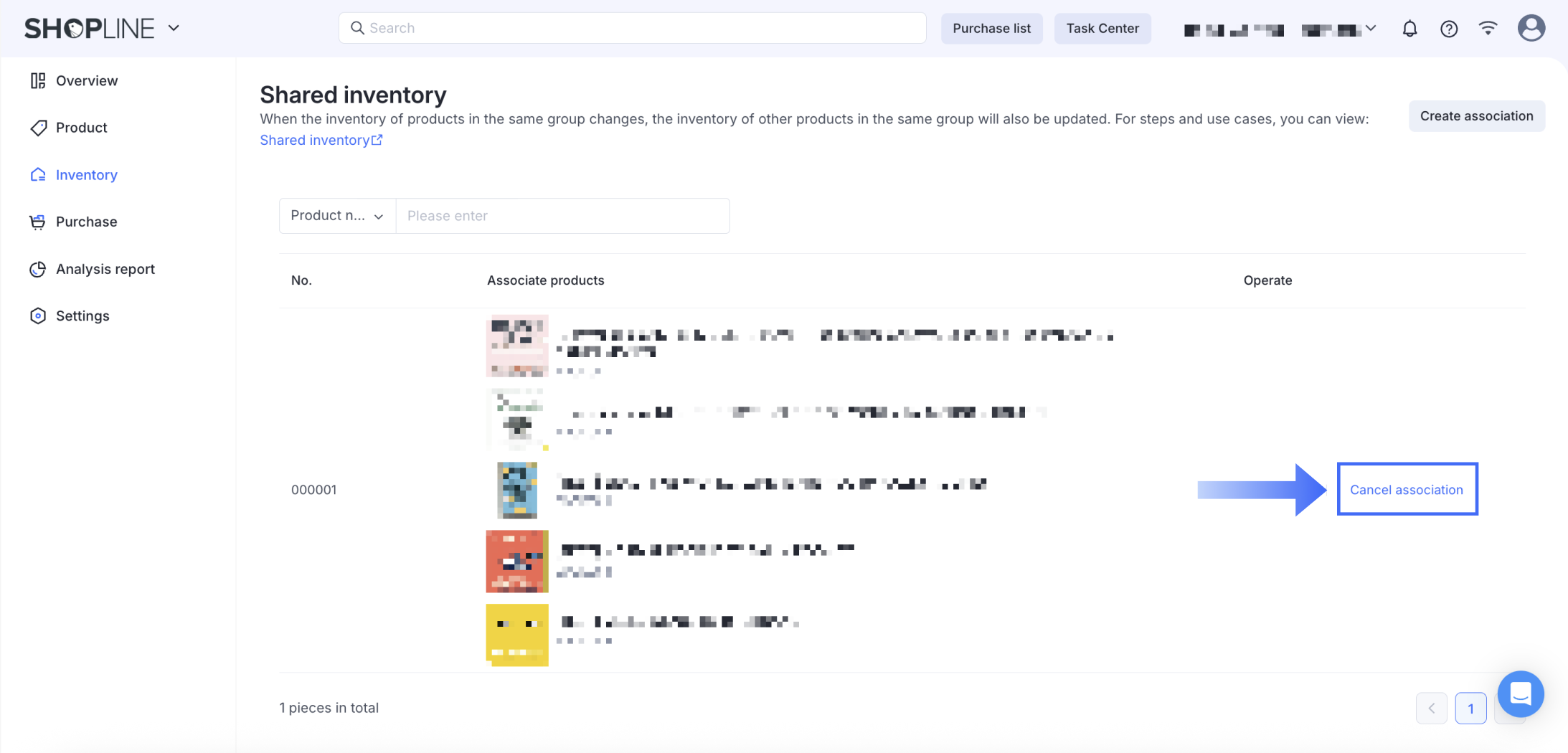 - From the Smart Inventory Management app, go to Inventory > Shared Inventory, and locate the relevant group. Click Cancel Association next to the SKU you want to remove association from.