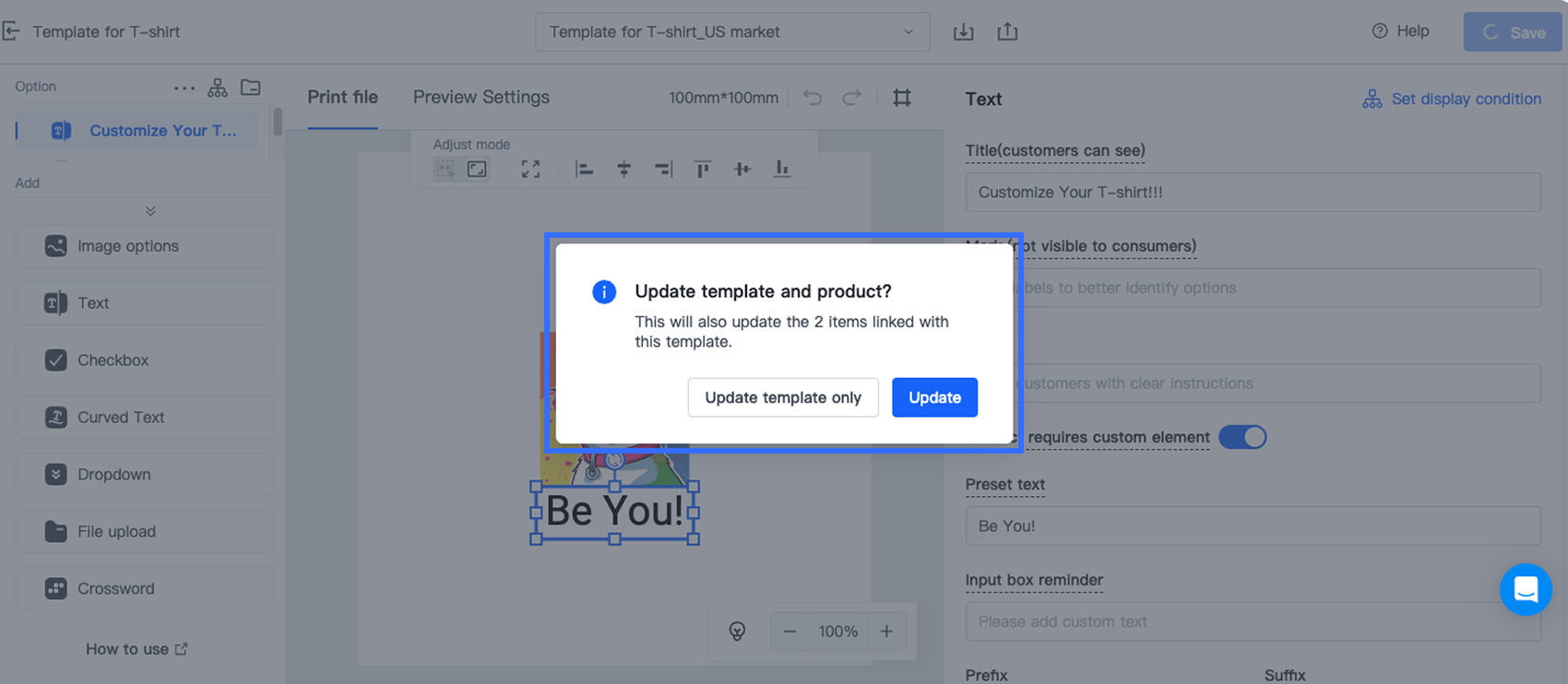 When a product is connected to a template, a label will appear at the top of the editor indicating the linked template. Editing the customization settings on this product’s editor page will not affect the template itself. Only the product’s own customization data will be updated and reflected on the storefront.