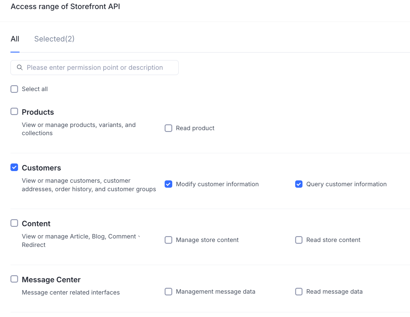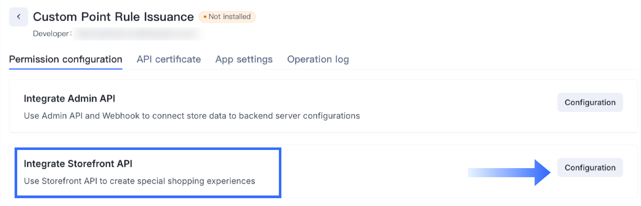 - In the app editor, go to Permission configuration > Integrate Storefront API > Configuration.