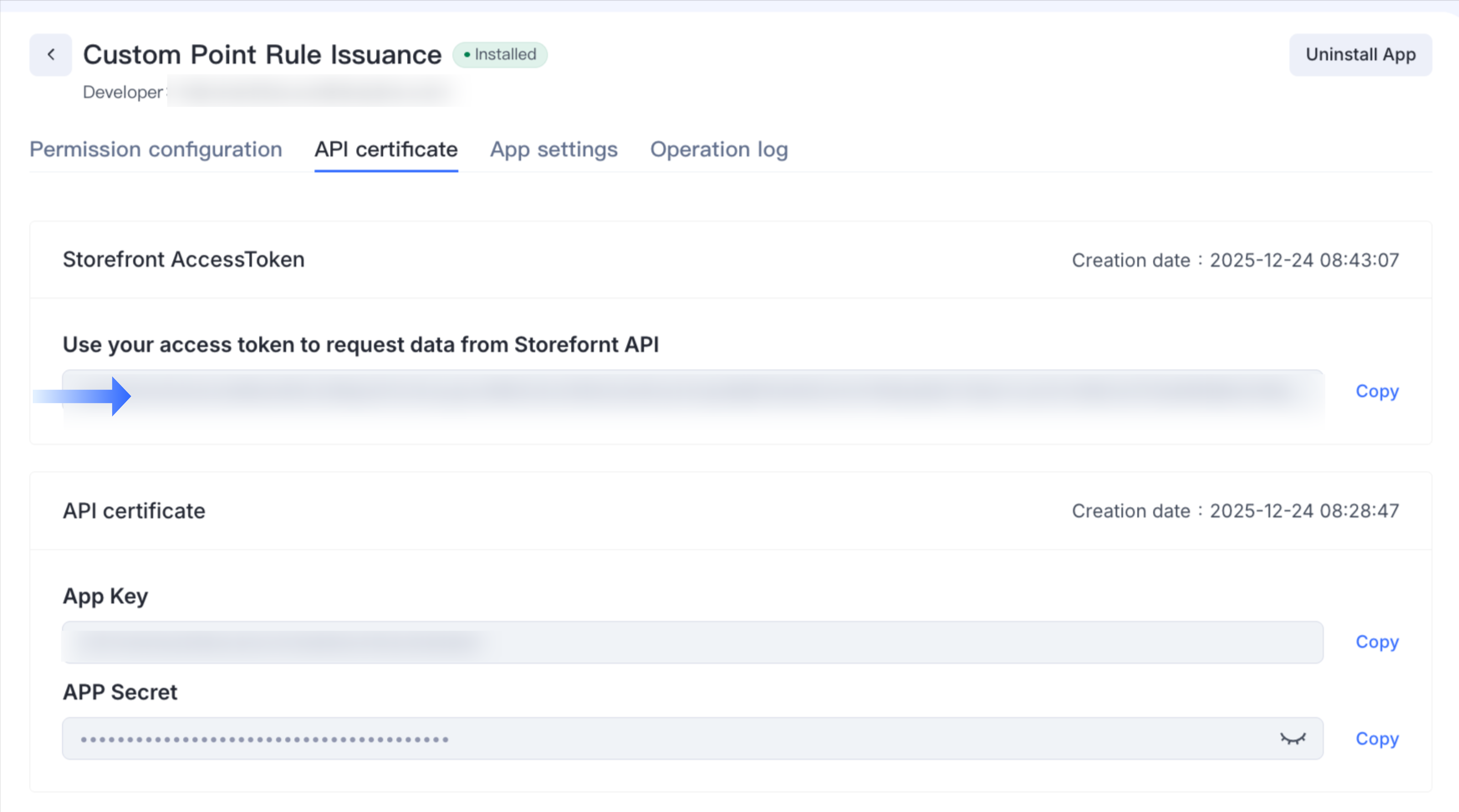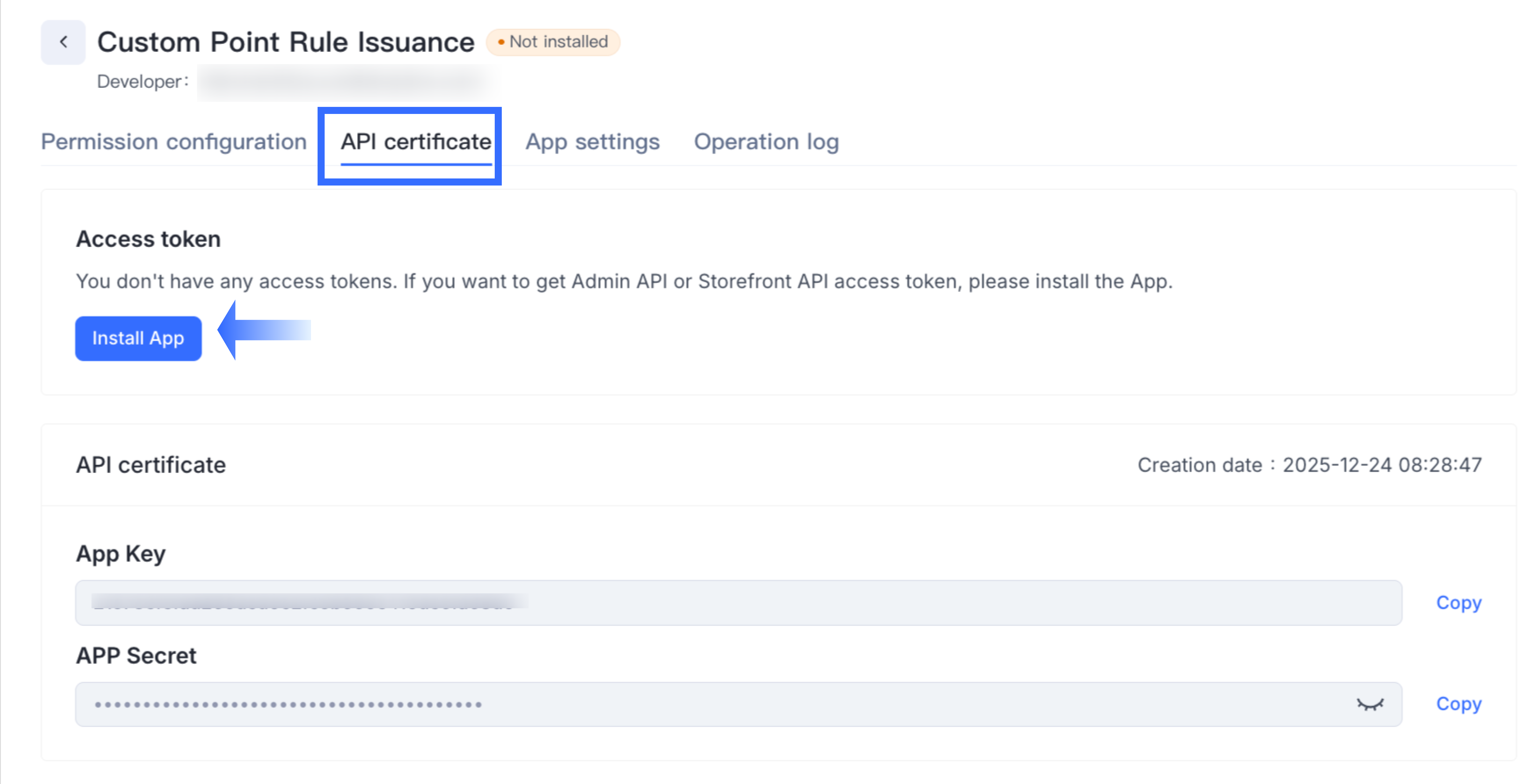 - Switch to API certificate > Access Token > Install App.
