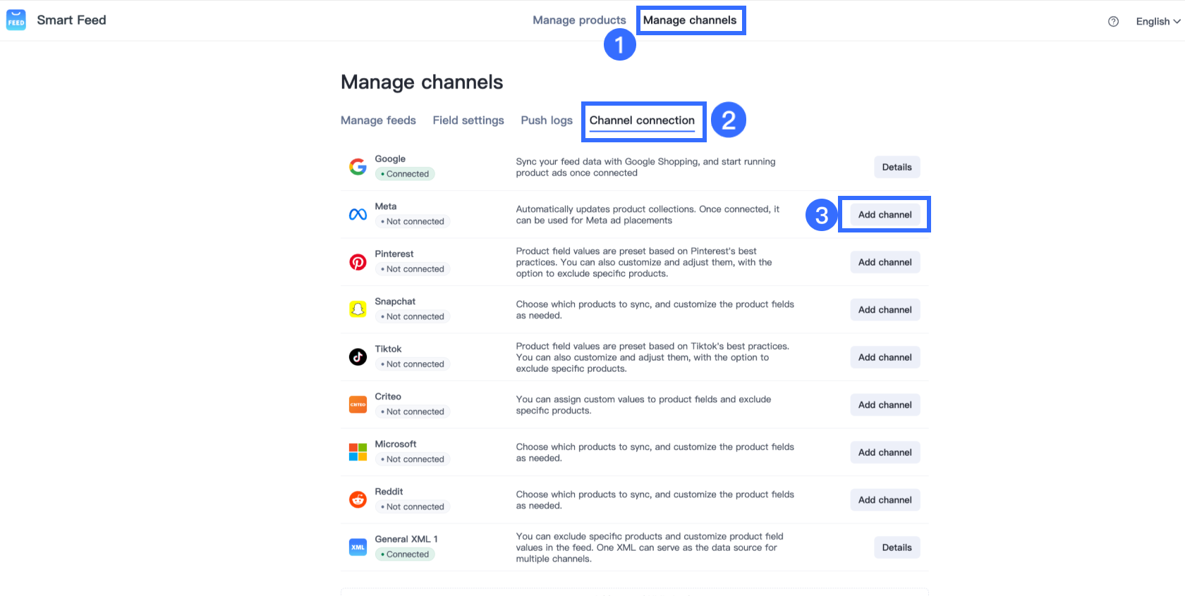 In Smart Feed, go to Channel Management > Channel Connection > Meta, then click Add Channel.
