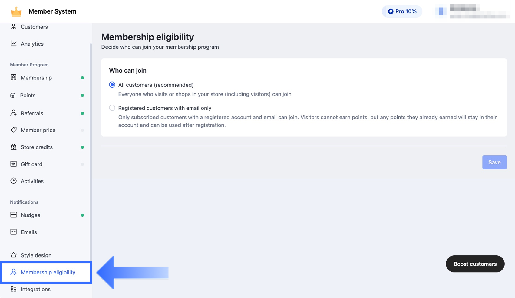 By default, your store is set to allow All customers to participate in the membership program. To change your eligibility strategy, follow these steps: