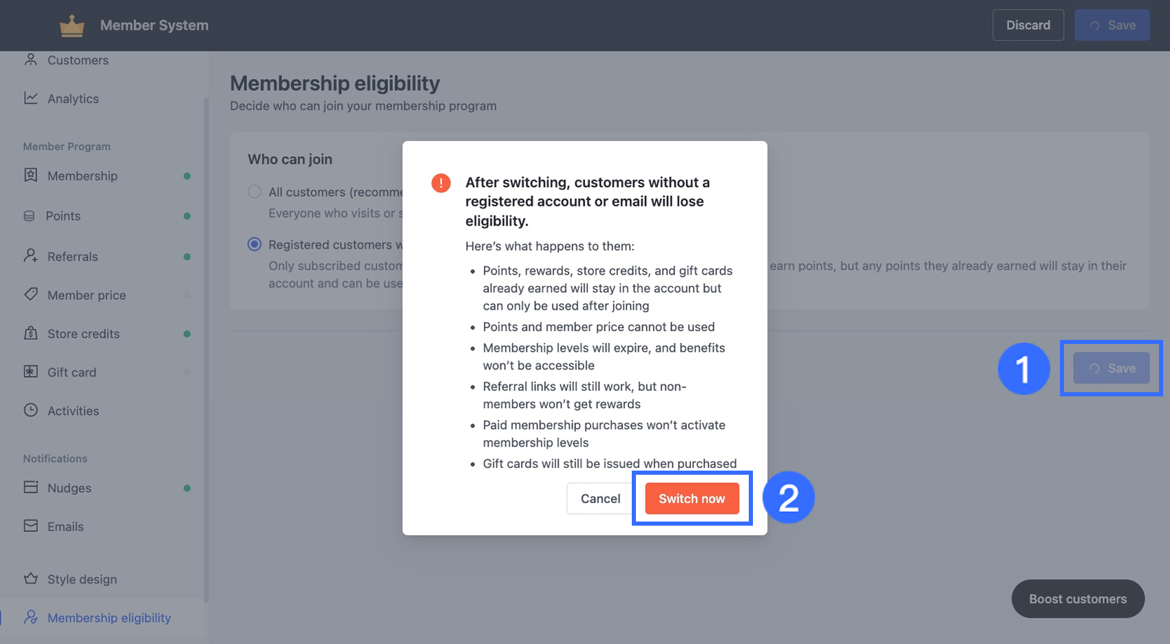 When you switch your eligibility strategy, the system will automatically update customer membership statuses. It is important to understand how this affects their points, tiers, and rewards.