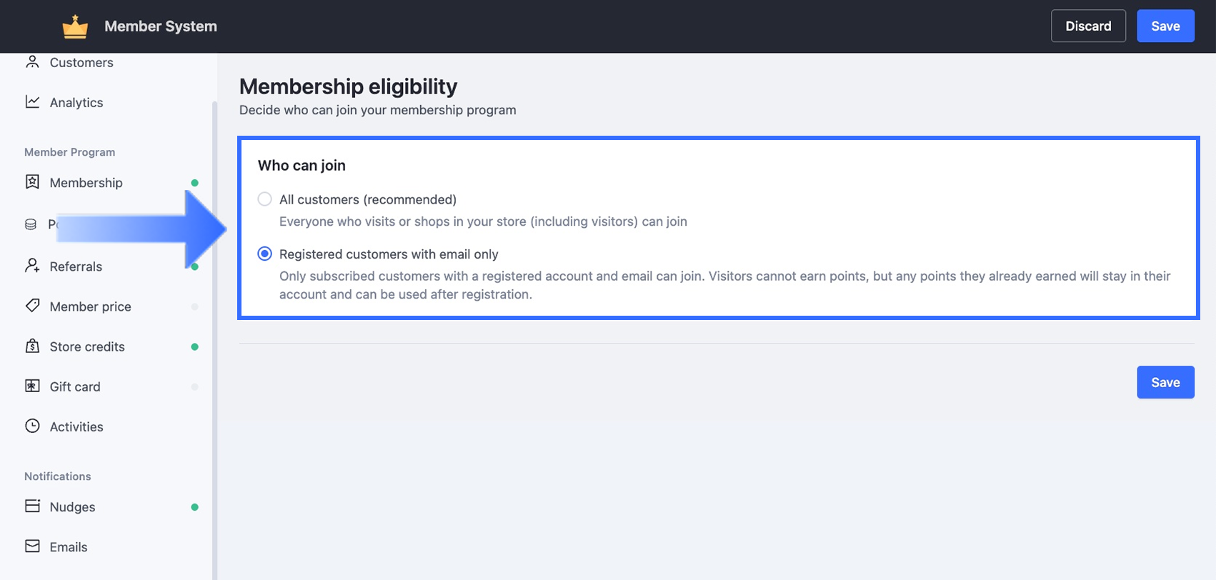 Member System allows you to control exactly who can participate in your store’s membership program. You can choose to enroll all customers automatically, ensuring even visitors can participate and earn rewards, or you can restrict membership only to customers who are registered and have a valid email address.