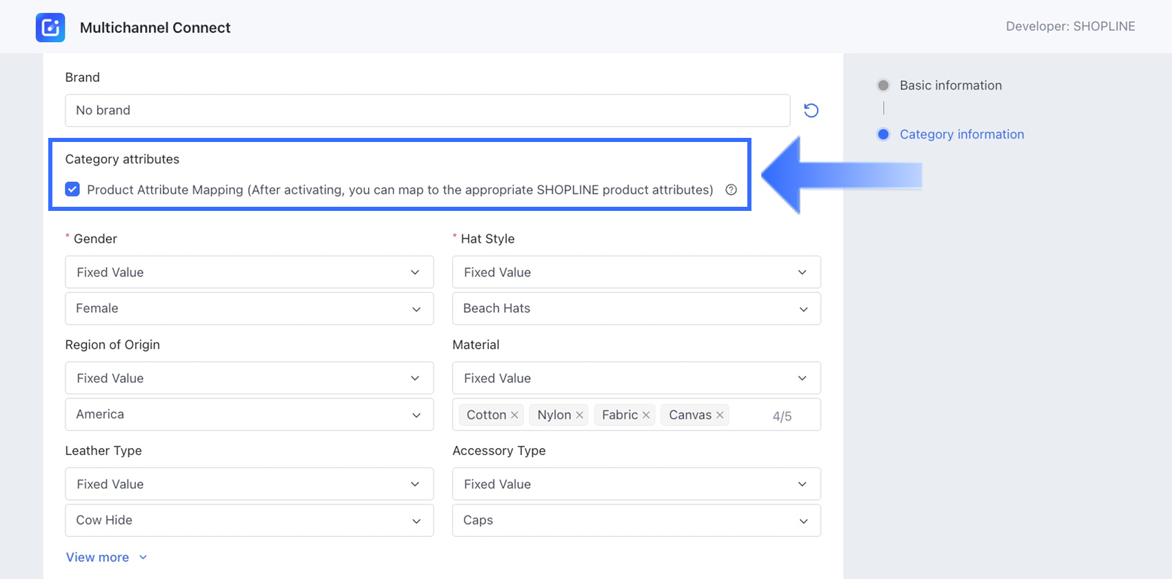SHOPLINE → Channel: Product attributes stored as SHOPLINE Metafields can automatically populate channel category attributes during product listing.