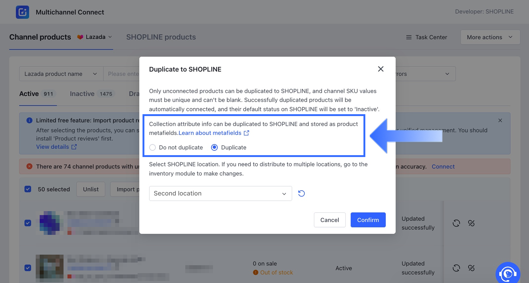 Channel → SHOPLINE: Channel category attributes can be saved back as SHOPLINE Metafields during product duplication.