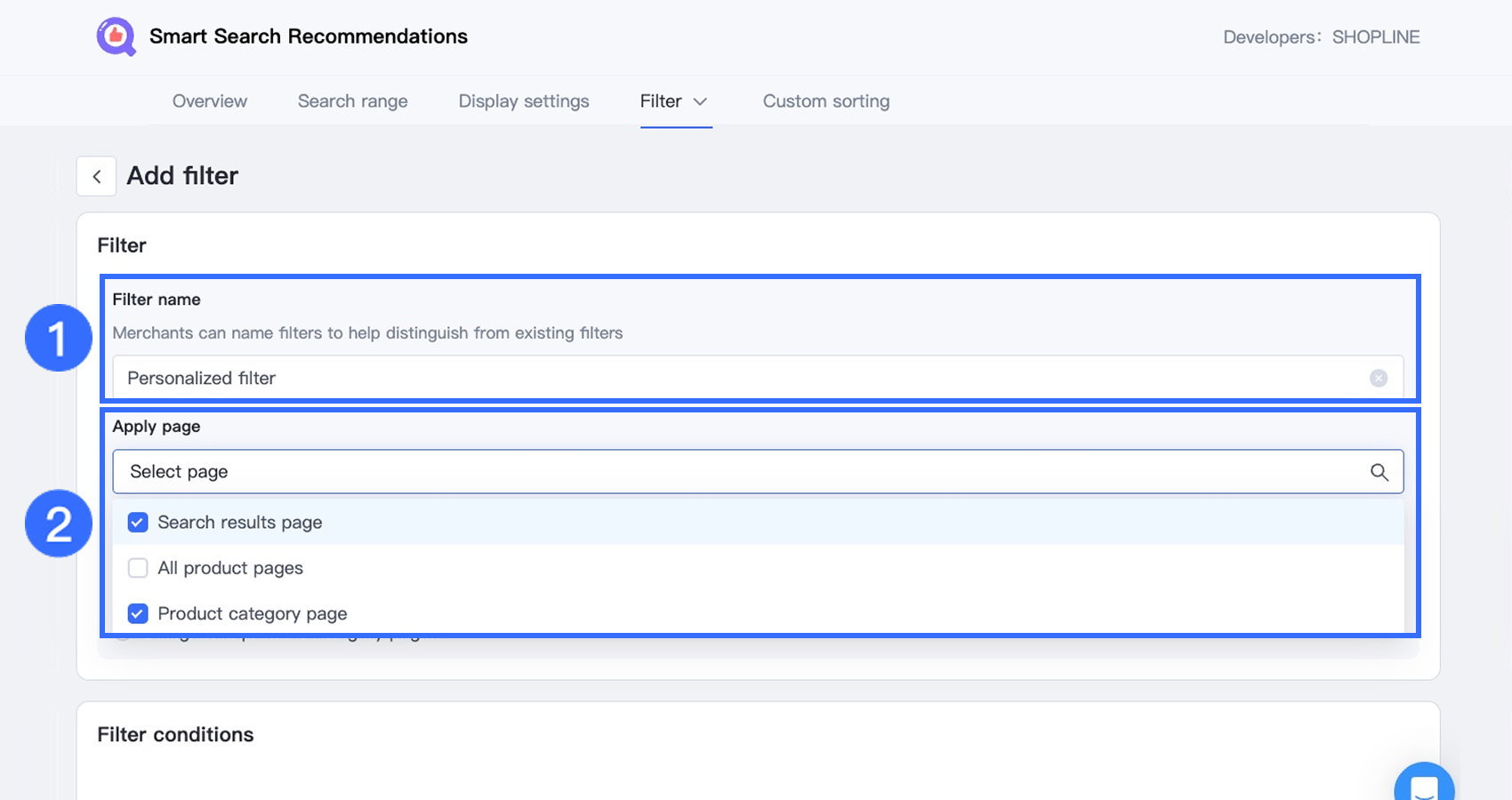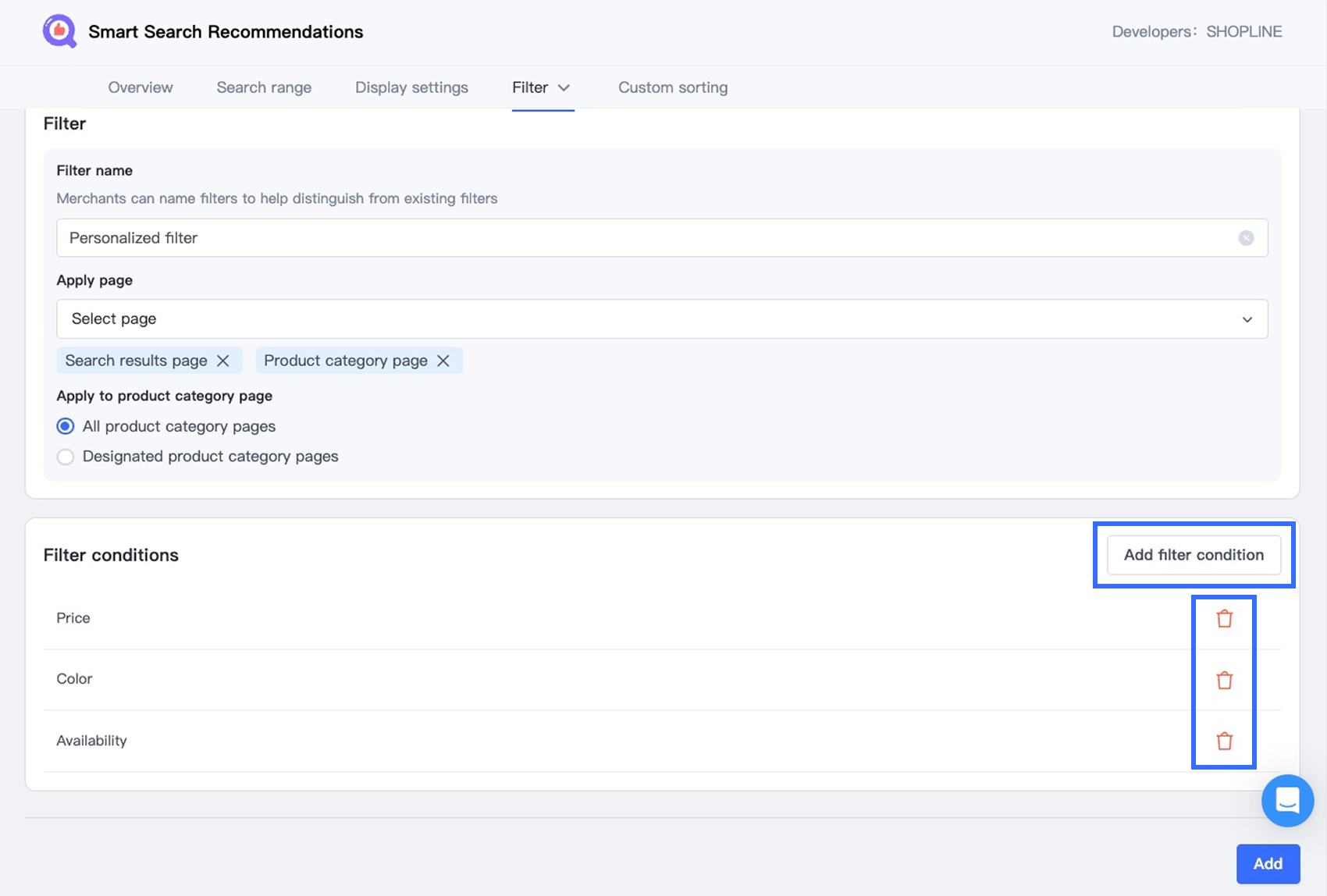 - Apply page: Shows where the filter is applied (e.g., Search results page, All product pages, Product category page)