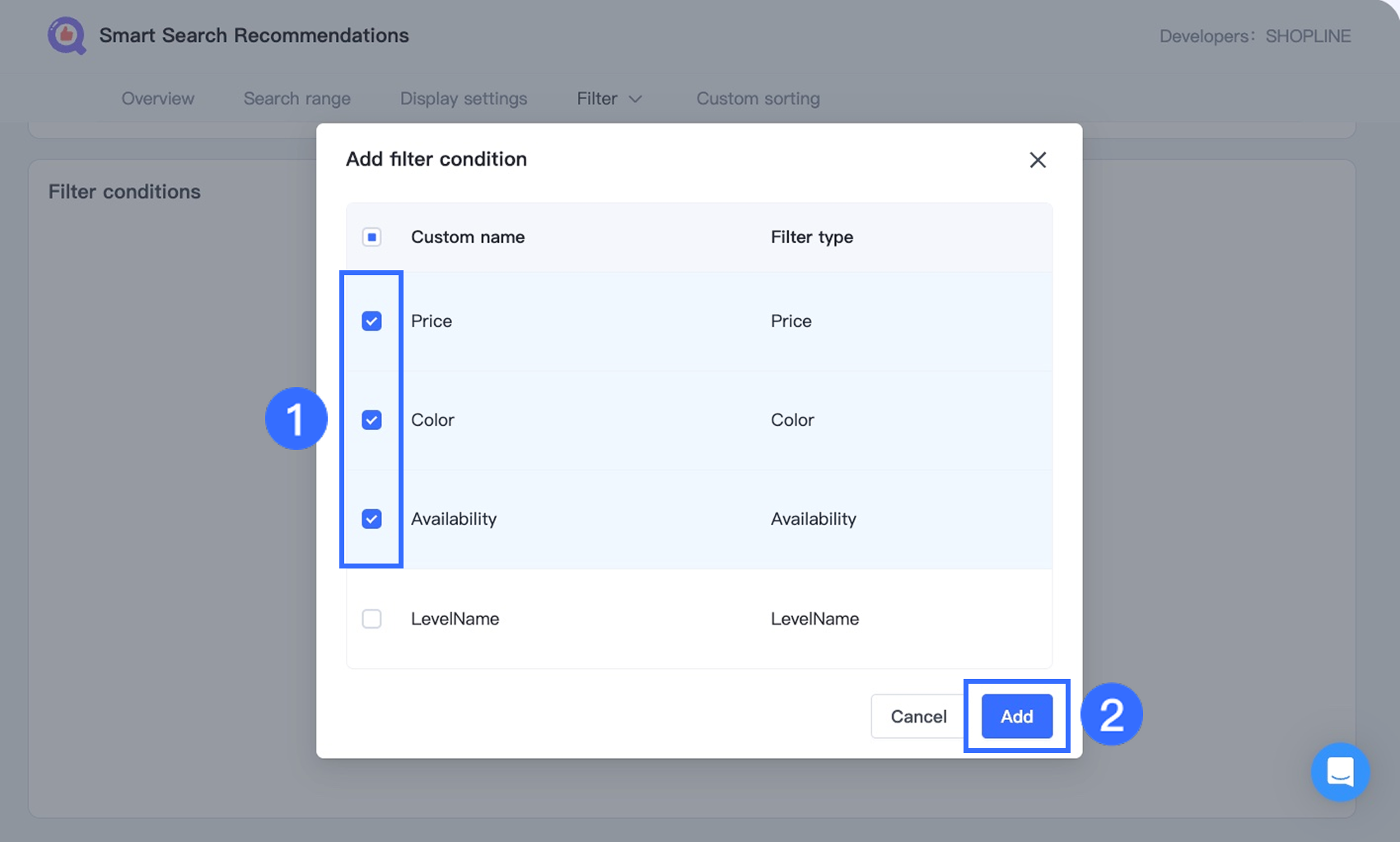 In the pop-up window, select one or more filter types (e.g., Price, Color), then click Add.