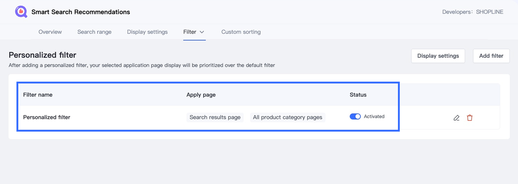 - Delete: Click the trash icon to remove unused filter configurations