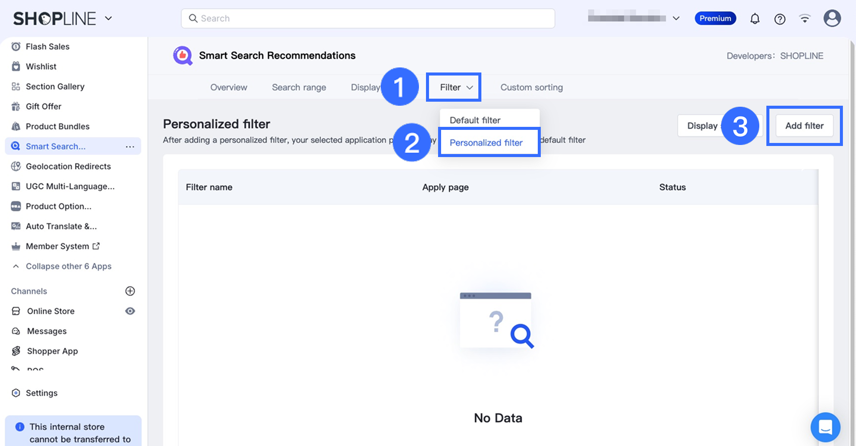 In your Smart Search Recommendation app, go to Filter > Personalized filter, then click Add filter in the upper-right corner.