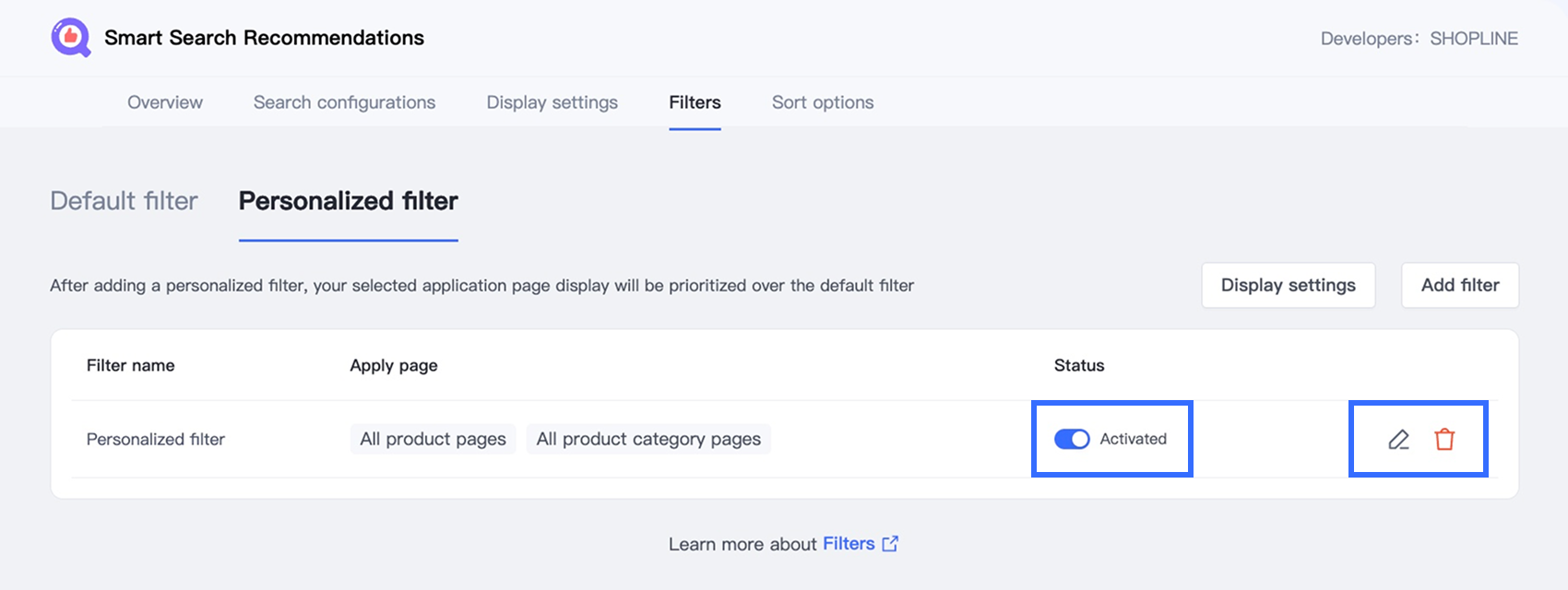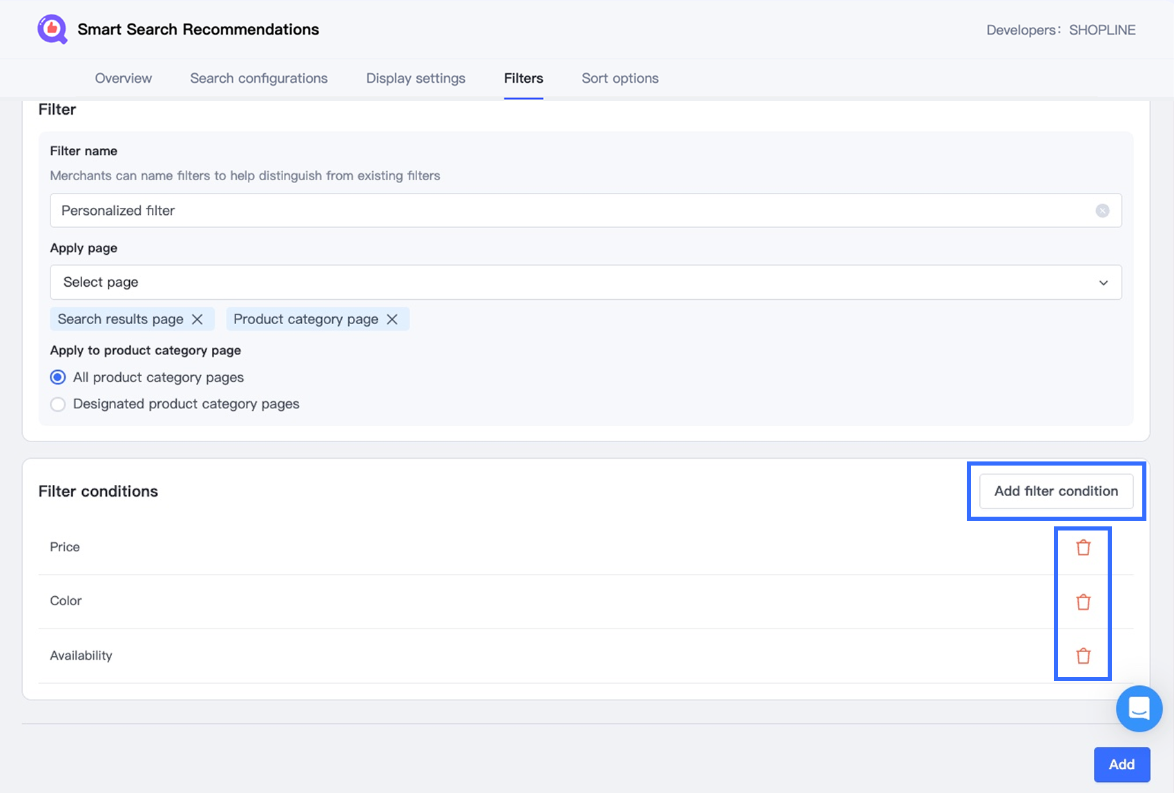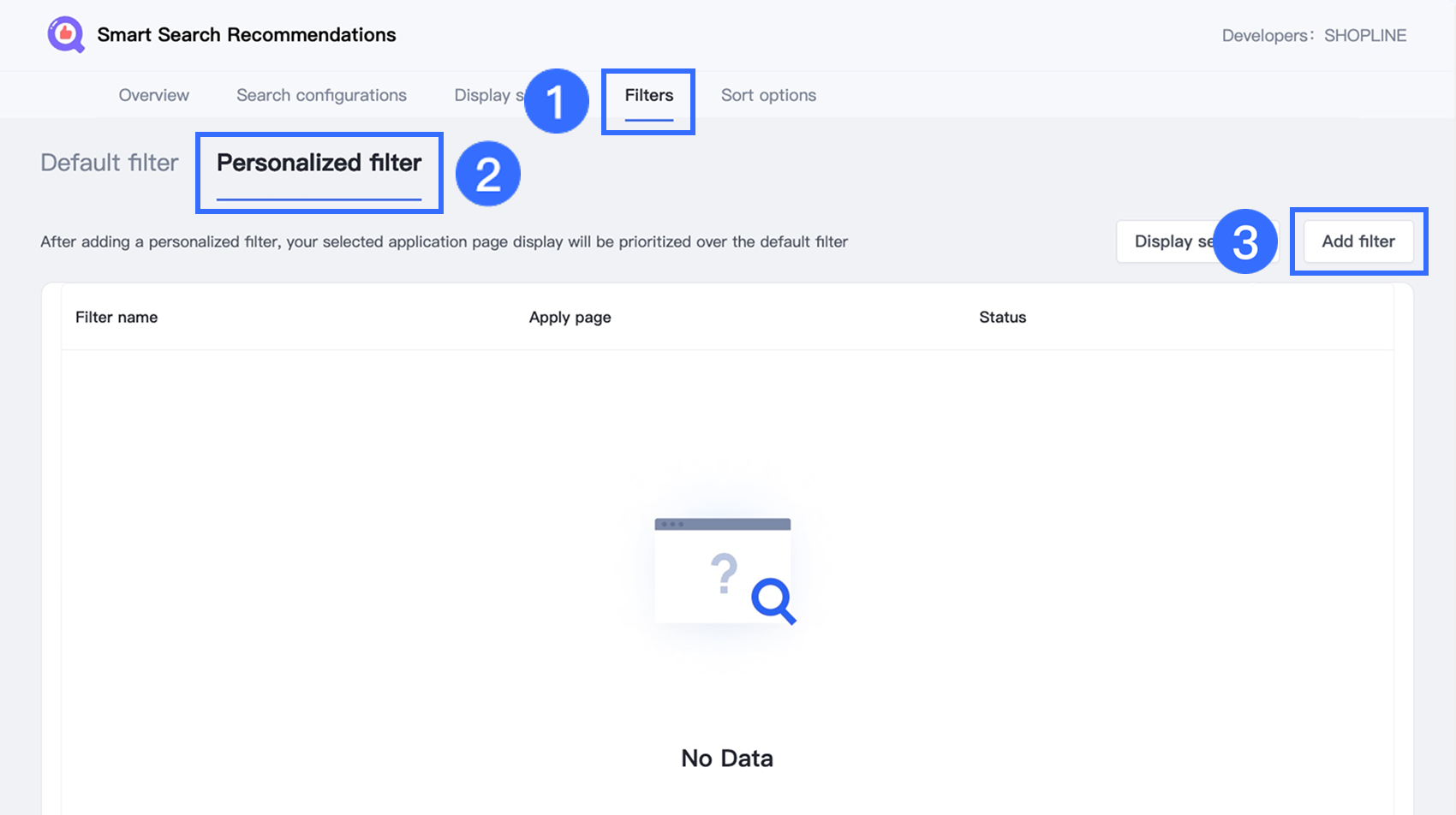 In your Smart Search Recommendation app, go to Filters > Personalized filter, then click Add filter in the upper-right corner.