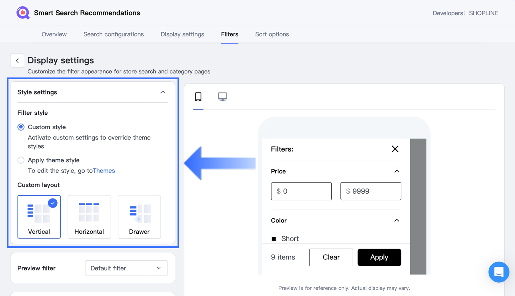 In your Smart Search Recommendation app, go to Filters > Default filter or Personalized filter, then click Display settings.