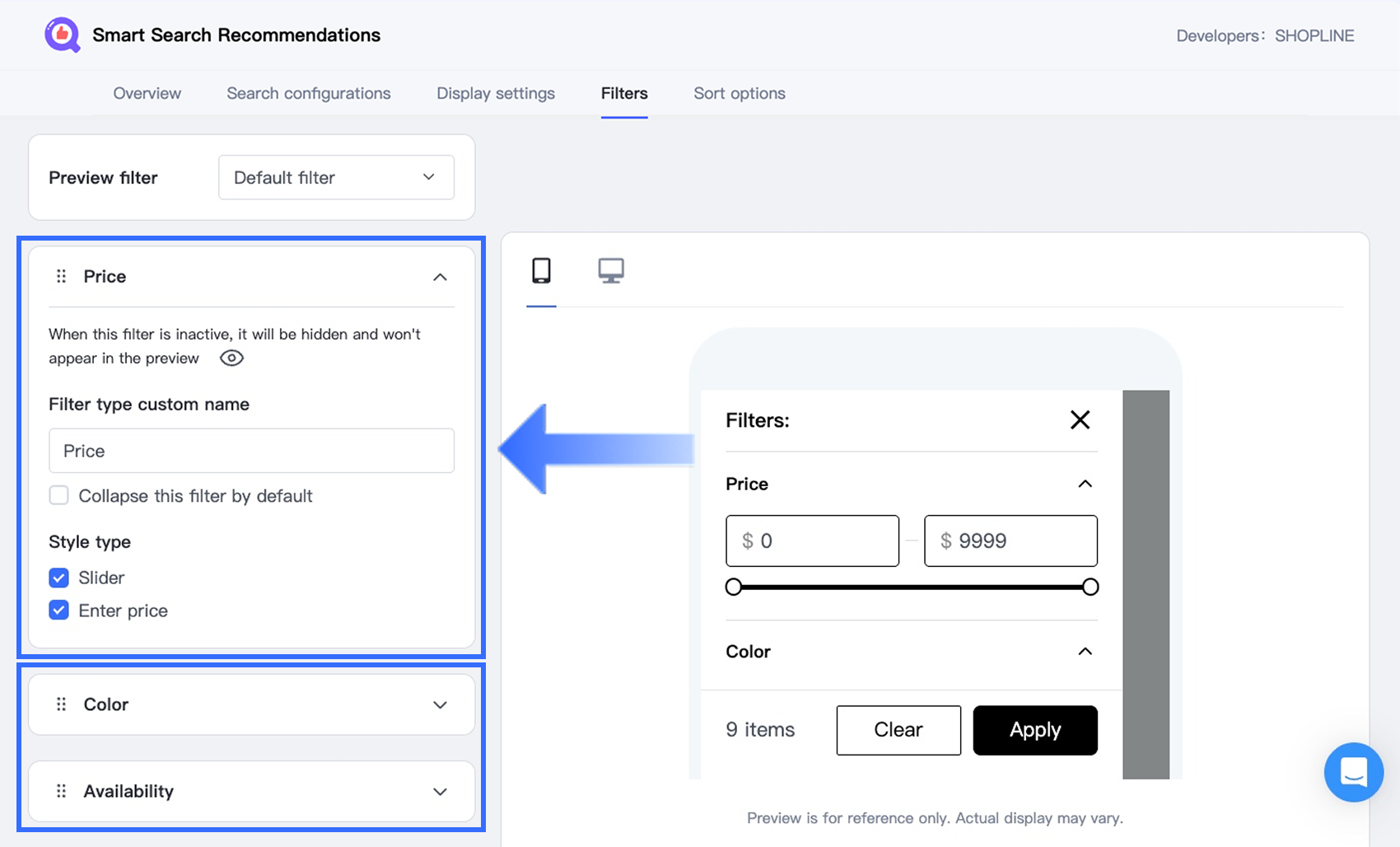 You can then customize the display settings for each filter (e.g., Price, Color) individually. Available options include: