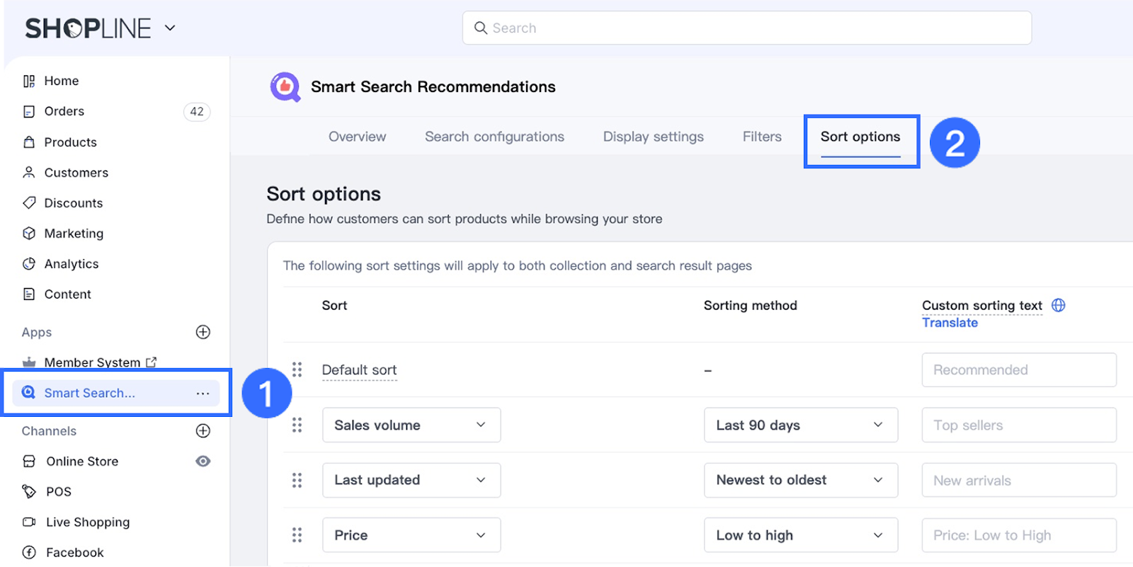 From your SHOPLINE admin panel, go to Apps > Smart Search Recommendation > Sort Options.