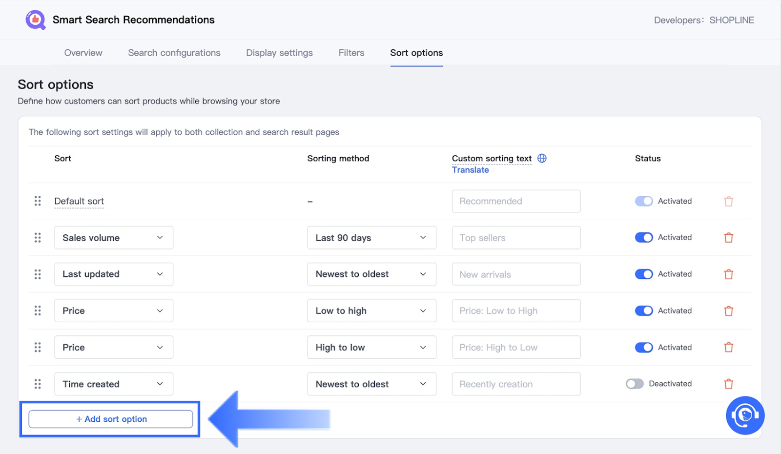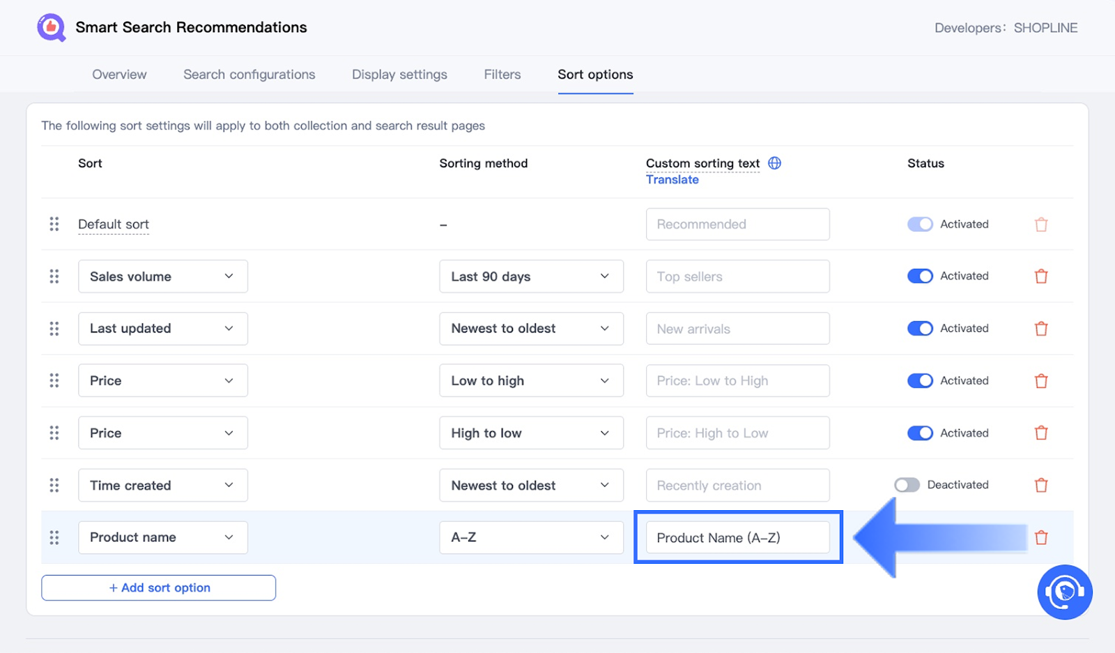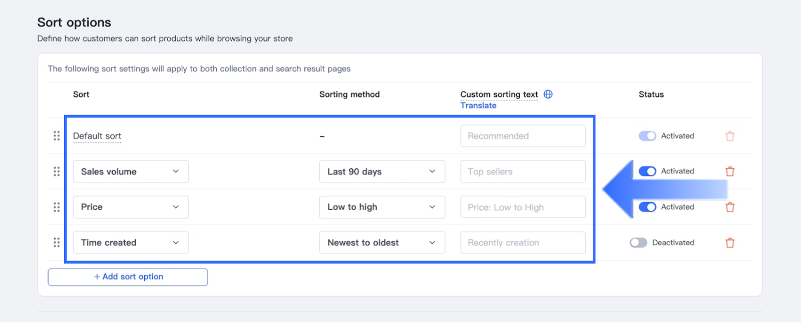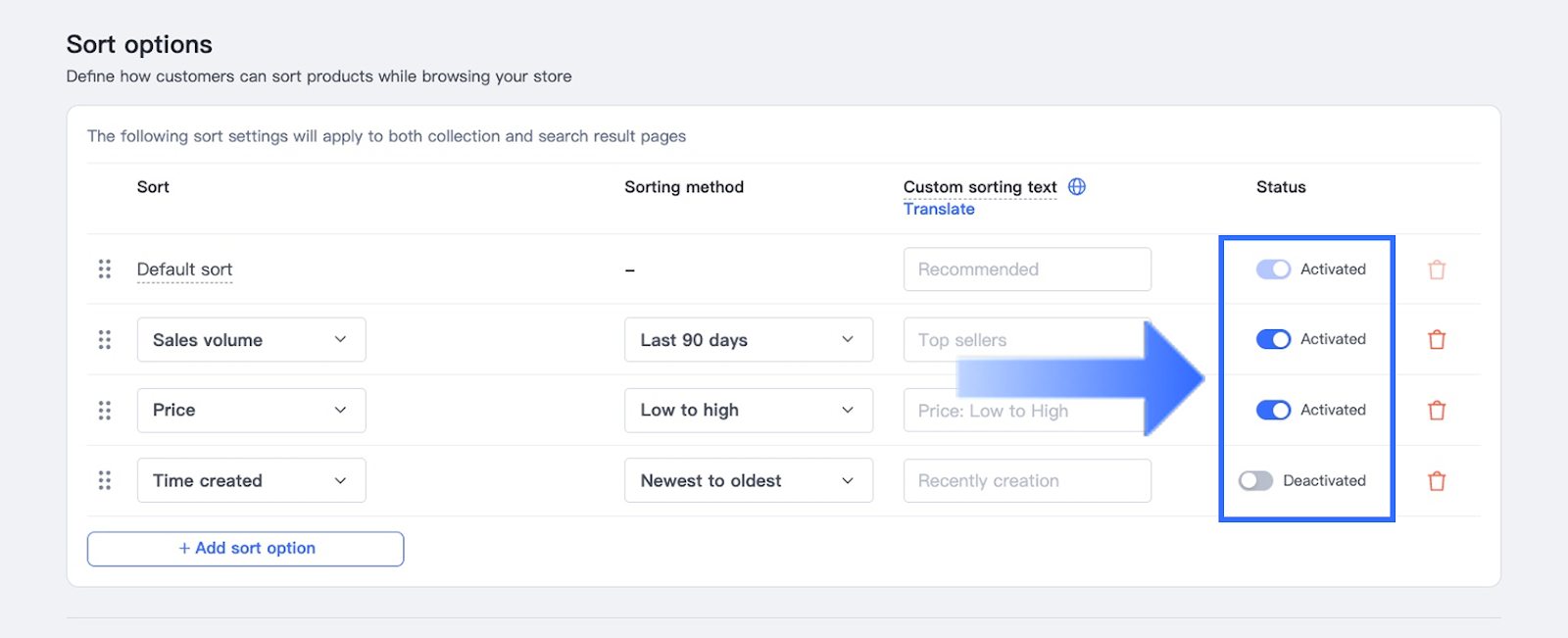 Note: Click Translate to view instructions on how to manage multilingual versions of the sorting label. - Toggle Status to Activated to enable the option.