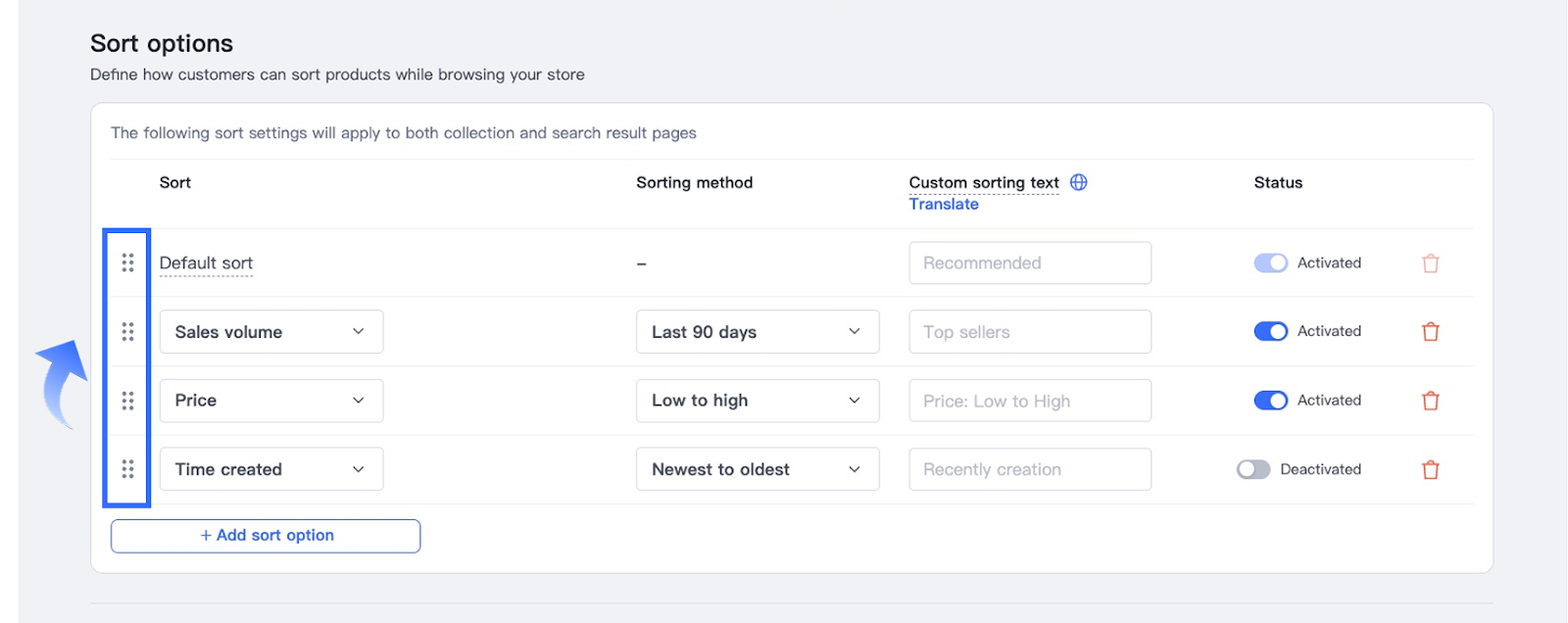 Reorder sorting options: Drag the six-dot icon on the left of each row to adjust the display order. The order determines how sorting options appear on the storefront.