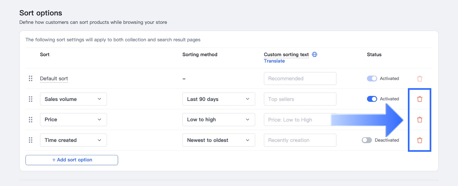 Delete sorting options: Click the trash icon on the right to remove a sorting option. Default sort cannot be deleted.