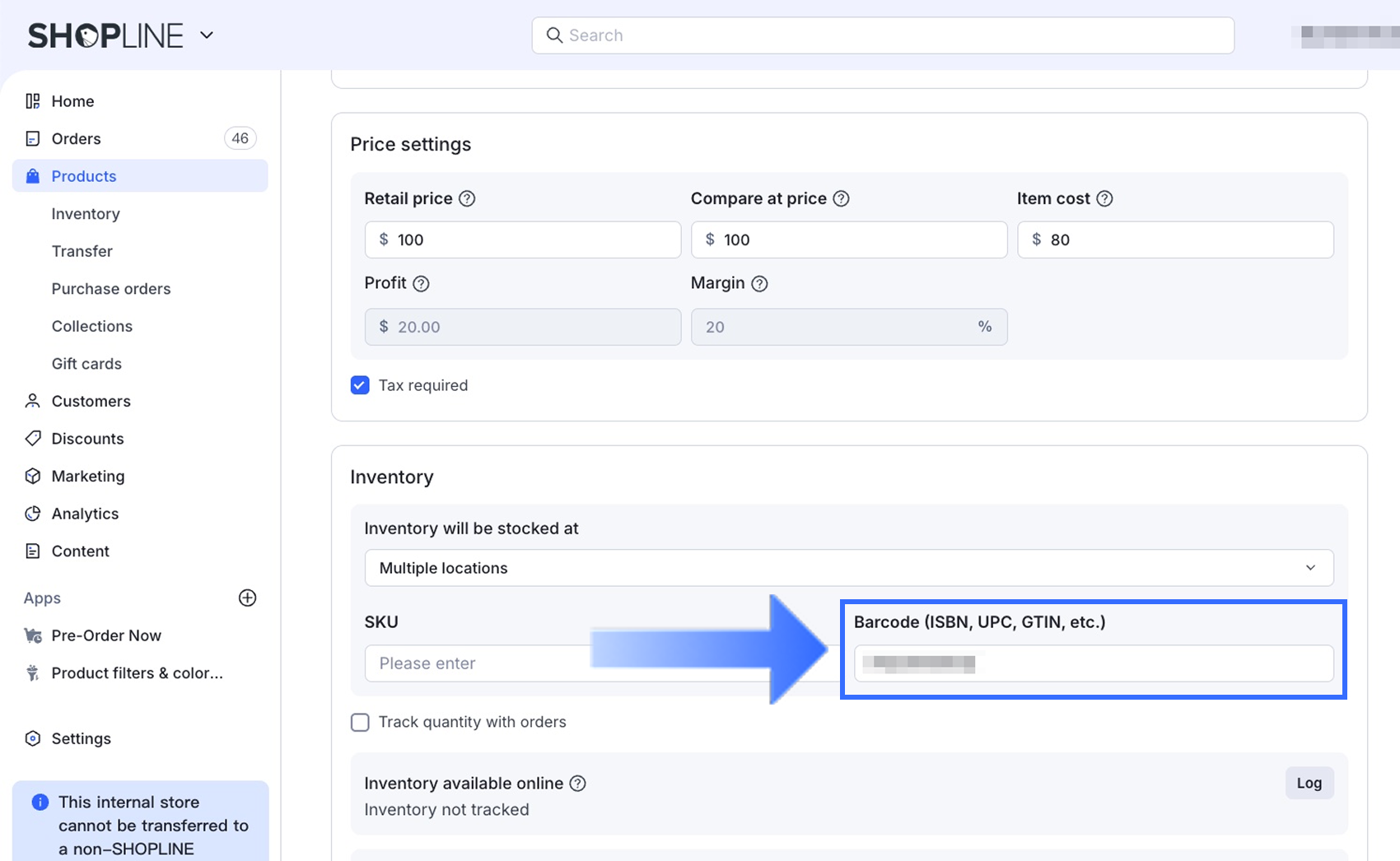For SHOPLINE stores connected to Google Merchant Center, the value entered in the Barcode field on the product details page is used as the GTIN when generating product data for GMC. Follow the steps below to set it up: