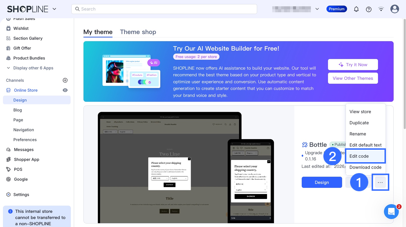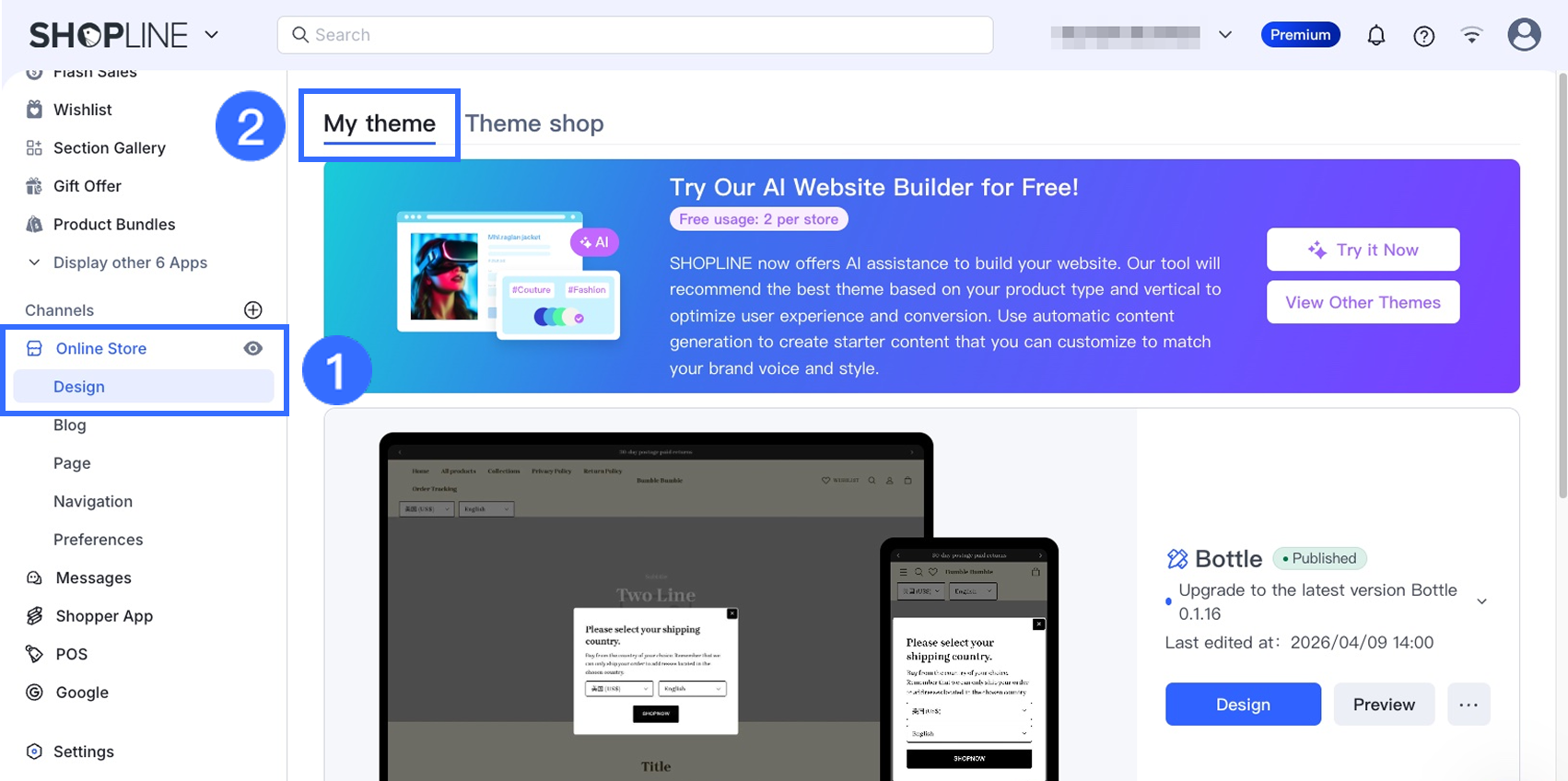 In your SHOPLINE Admin, go to Online Store > Design > My theme, then locate your current theme.