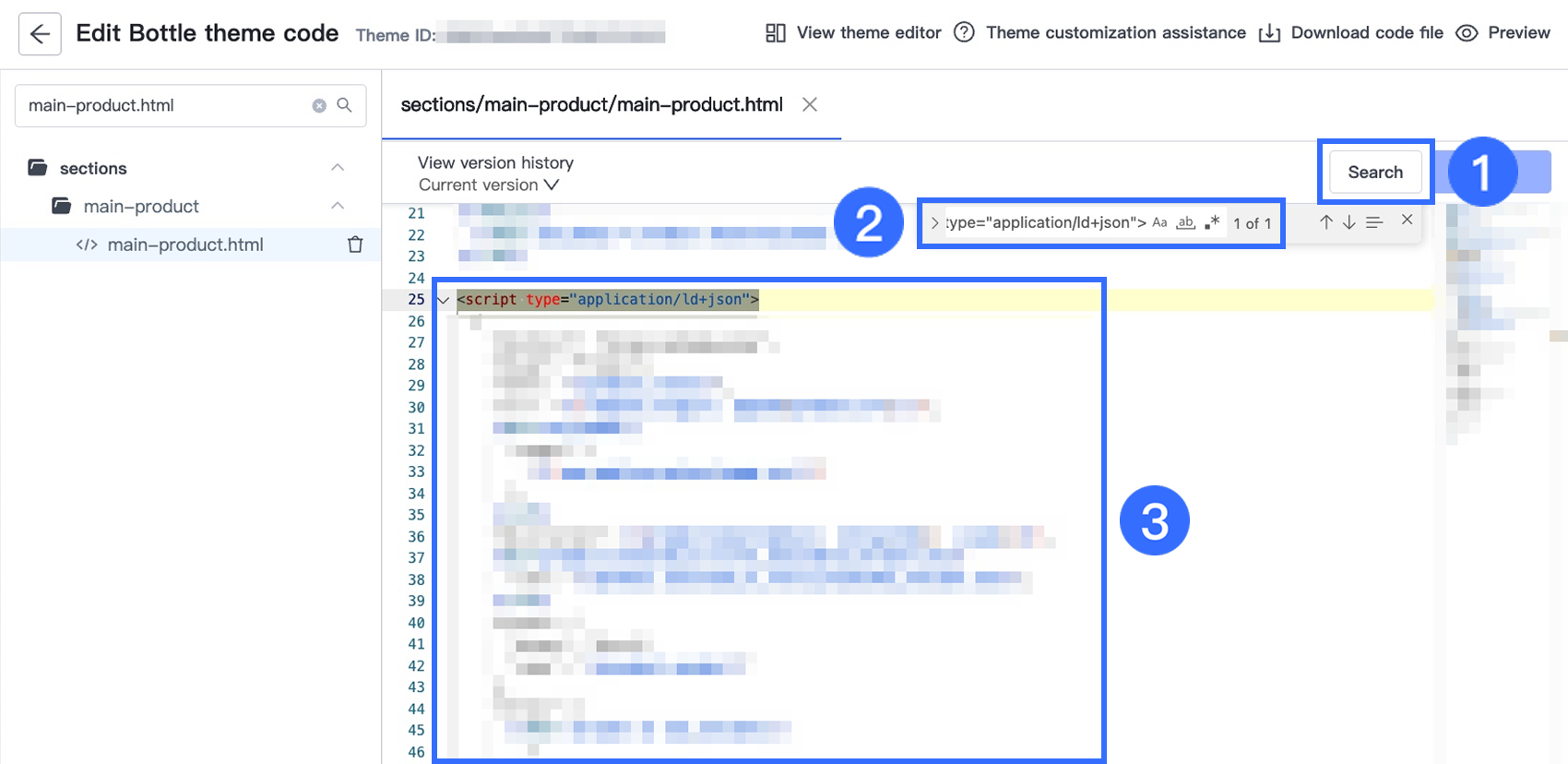 Click Search, then locate the <script type="application/ld+json"> tag and its contents (this is the structured data).