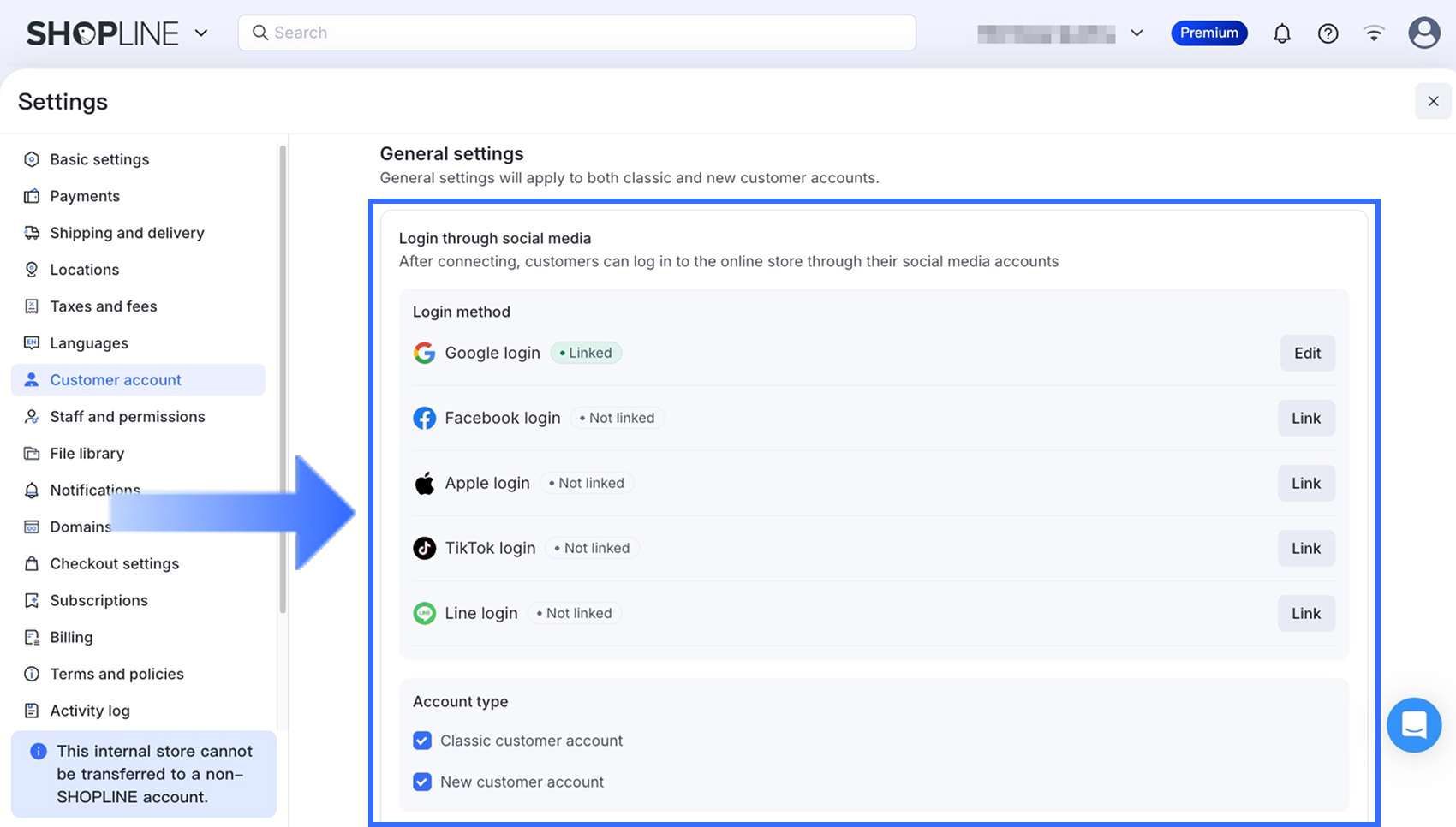 From your SHOPLINE admin panel, go to Settings > Customer account. In the Select the client account version to link section, you can select the customer account version to use.