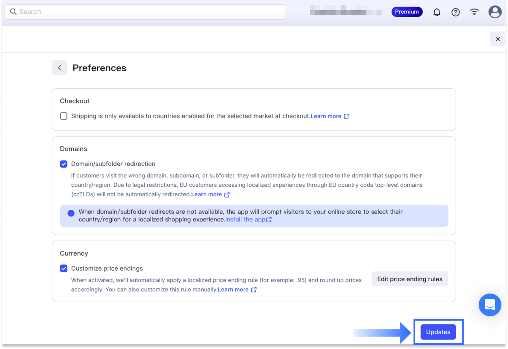 SHOPLINE管理画面で、設定 > マーケット に移動し、プリファレンス設定をクリックします。