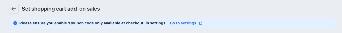 - アクティビティ設定ページでは、プロンプトバナーが表示されます。 "設定に移動" をクリックして、チェックアウト設定ページに移動します。ここで、"割引コードは支払いページでのみ使用できます" を選択すると、カートページの割引コード入力ボックスが無効になります。この操作により、カート内に割引コード入力項目が表示されなくなります。