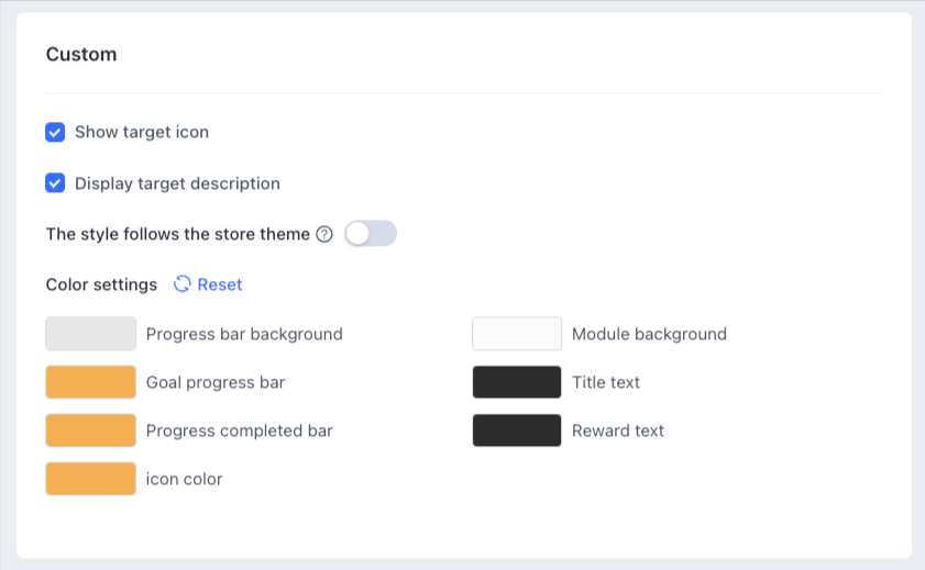 - カラー設定:進捗バーの背景、目標進捗バー、進捗完了バー、アイコンの色、モジュールの背景、タイトルテキスト、およびリワードテキストの色をカスタマイズします。