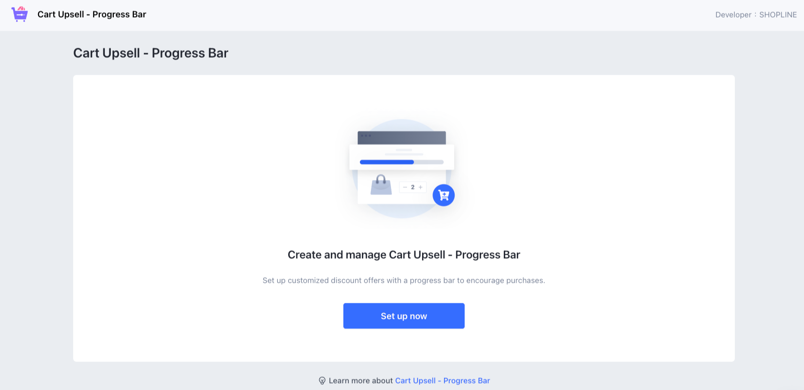 アクセス:カートアップセル - プログレスバーアプリのトップページで「今すぐ設定」をクリックします。