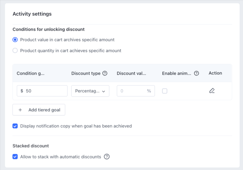 - リワード設定:ここでは、顧客が目標に達したときの目標とリワード、リワードアニメーション、およびカスタマイズされた目標コピーを設定できます。