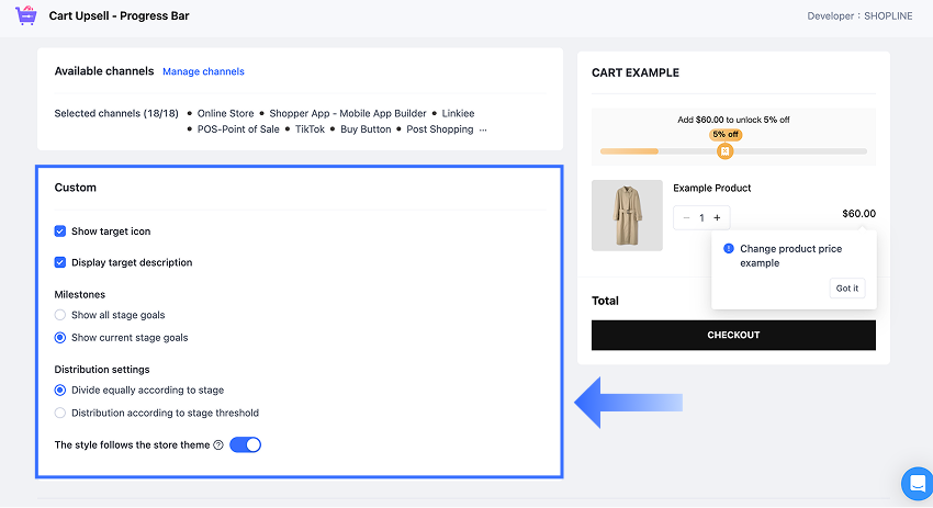 - スタイルはストアテーマに従う:このオプションを有効にすると、プログレスバーの色、フォント、角の半径が自動的にストアのテーマに合わせて調整されます。