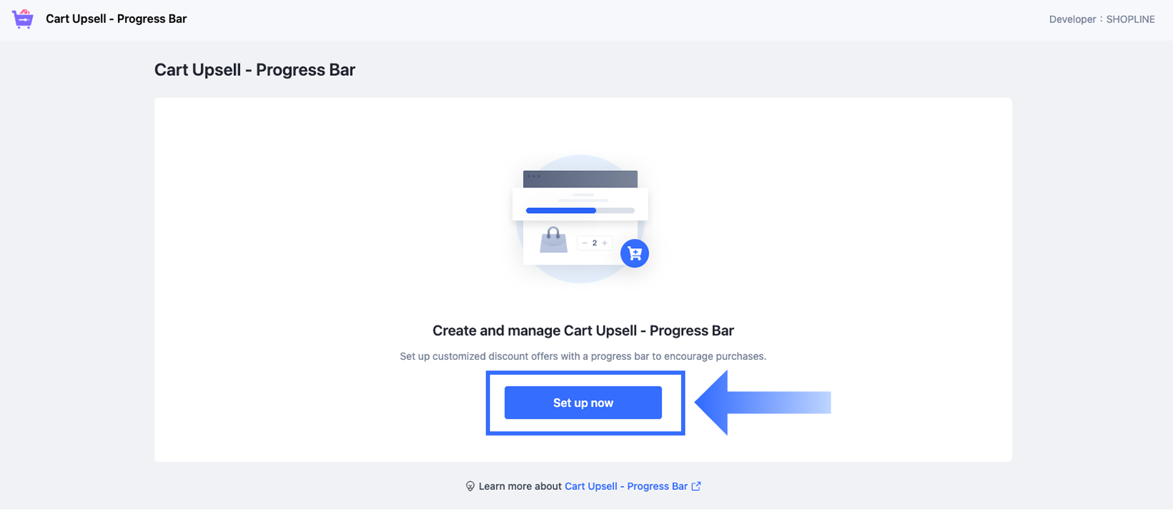 カートアップセル - プログレスバーのトップページで、今すぐ設定ボタンをクリックして、カスタマイズした割引オファーの作成を開始します。