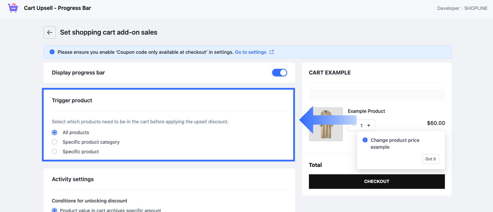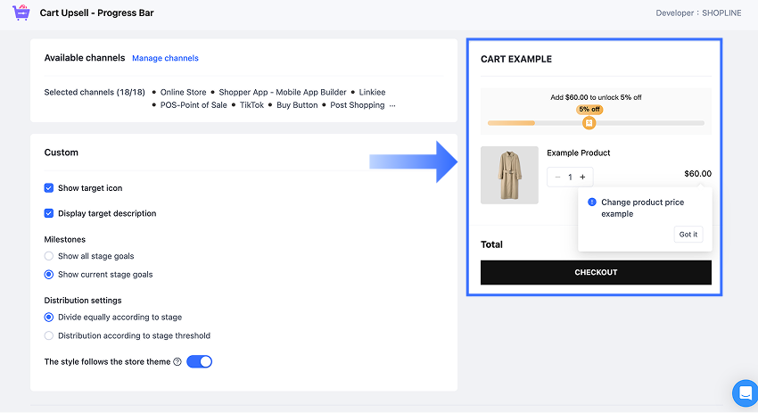 Note: 各ストアでは、同時に1つのカートアップセルルールのみ設定可能です。プログレスバーはカートページにのみ表示され、チェックアウトページには表示されません。 -