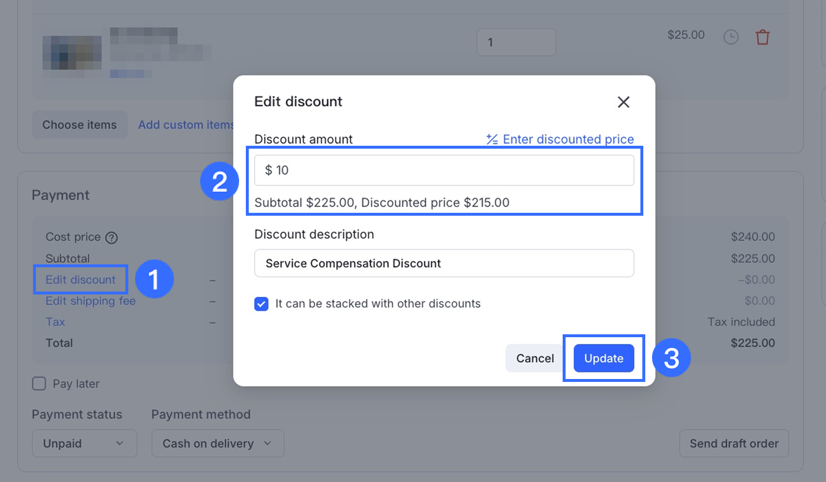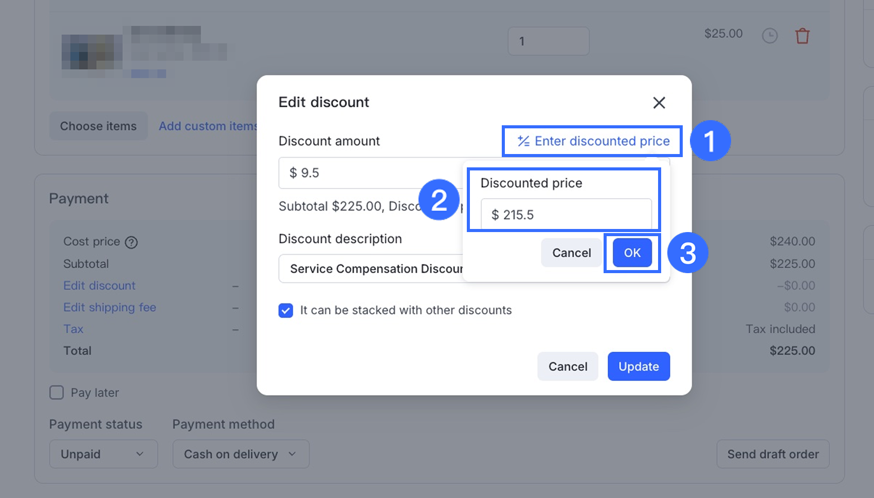 割引金額を入力:割引金額を直接入力し、更新をクリックします。システムは支払いセクションの注文合計を自動的に更新します。