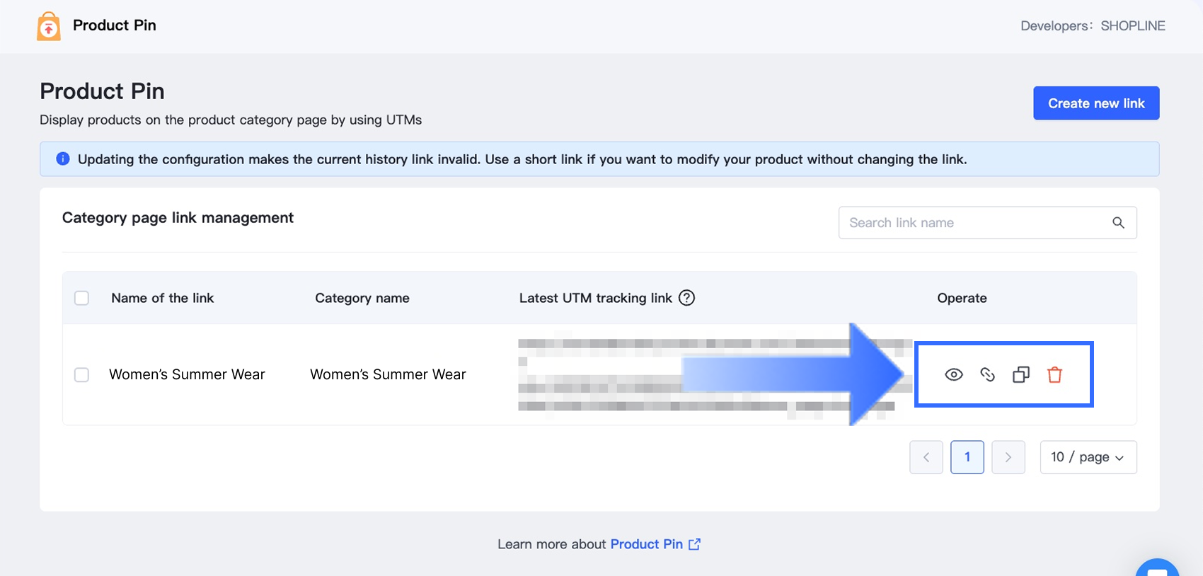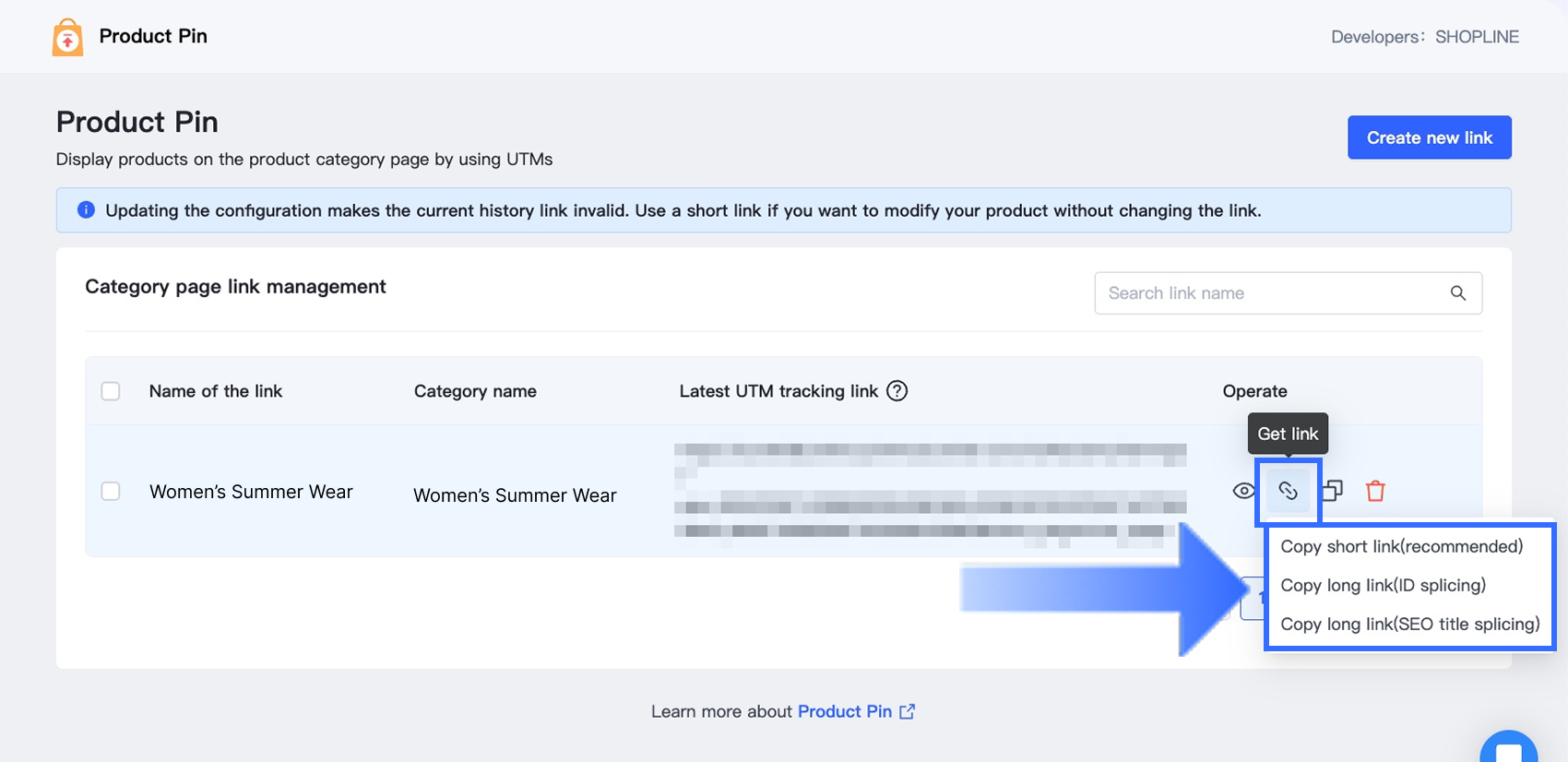 トップ固定の設定が完了すると、システムは自動的にカテゴリページ用のUTMトラッキングリンクを生成します。コピーしたいリンクはトップ固定アプリのトップページで見つけ、リンクアイコンをクリックして、目的のURLタイプを選択し、マーケティングキャンペーンやコンテンツ配置に使用するためにコピーできます。アプリは以下の3種類のリンクをサポートしています: